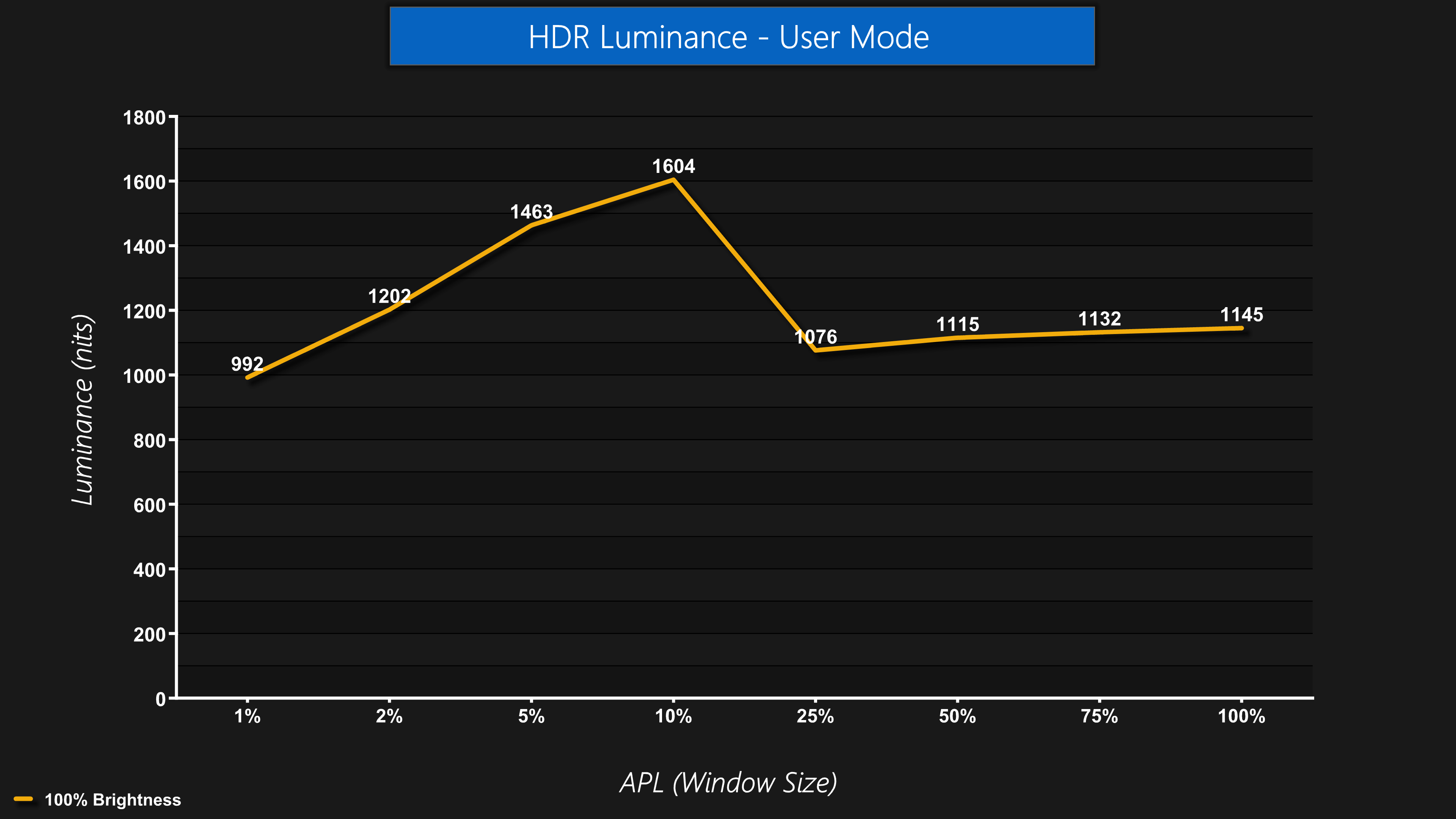 HDR brightness is very impressive. Cooler Master claims a peak of 1500 nits, but we hit 1604 nits at a 10% APL. This does tail off at smaller window sizes, with a 1% APL delivering 992 nits, but that is still very impressive for a relatively budget HDR screen. Full screen brightness is also a rather eye-searing 1145 nits, one area where we see a clear advantage to mini-LED versus OLED, considering OLEDs can't typically sustain full-screen brightness above 250 nits.