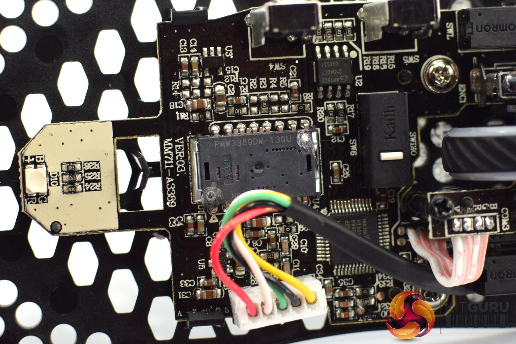 The side buttons are also unlabelled so we don't know who manufactures these, but the final thing to note is the PMW 3389 sensor used for the MM711.