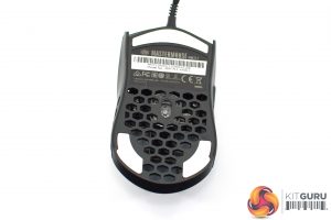 Flipping the mouse over reveals its underside, with three PTFE mouse feet used here. The PMW 3389 sensor lens is visible in the middle, surrounded by more holes.