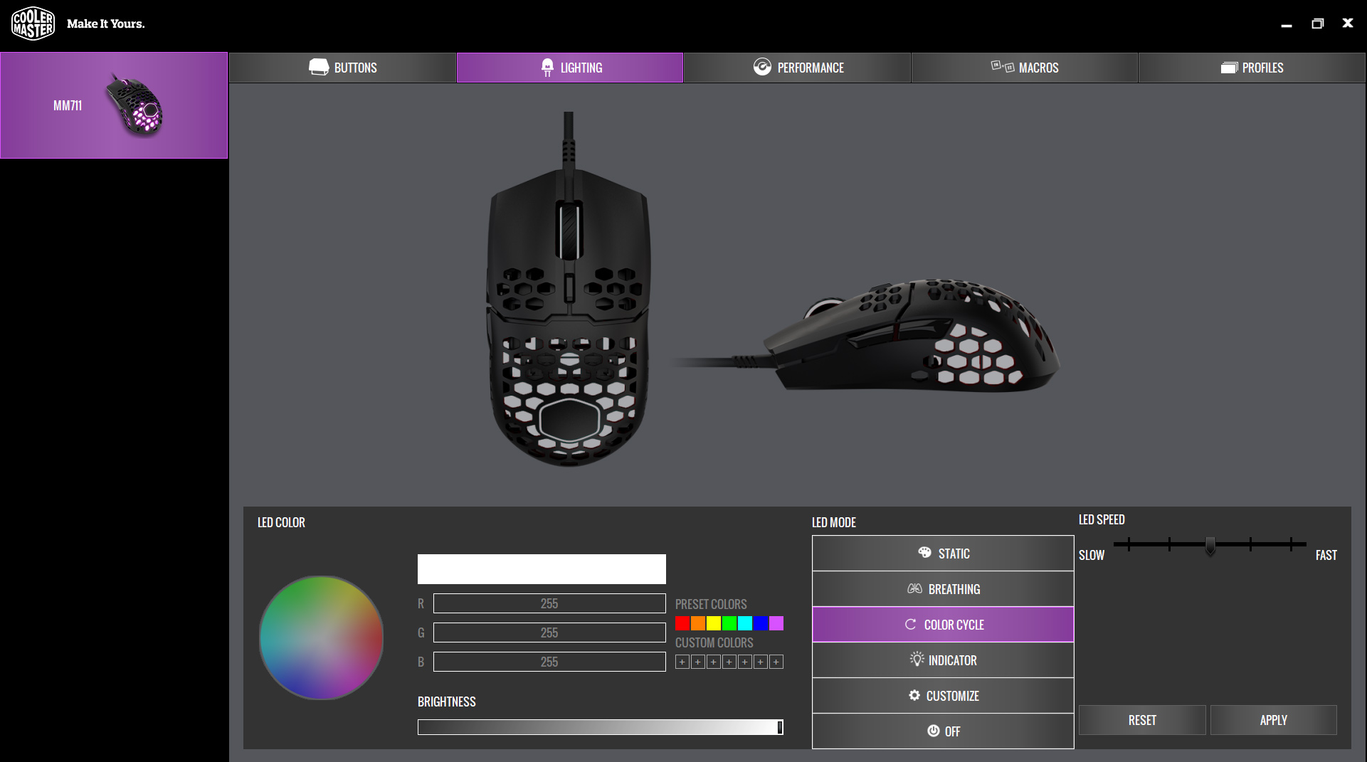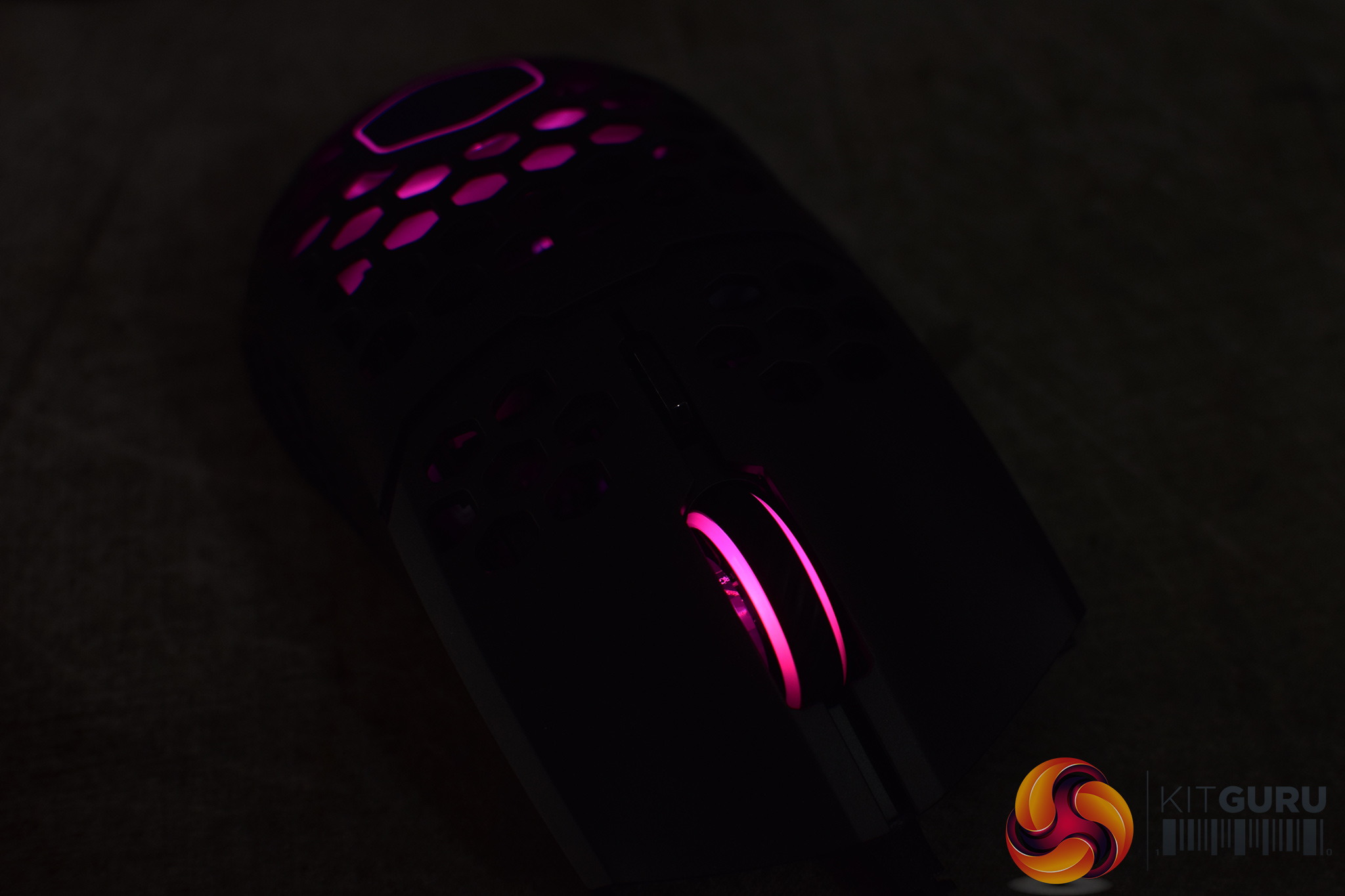 The MM711 has two RGB lighting zones – the scroll wheel, and a section towards the back of the mouse. There's not a whole lot to say here – the colours look good and the LEDs certainly get bright enough, but I do think Cooler Master could do with a few more lighting presets to choose from. Additionally, while there is a ‘customise' option for the RGB LEDs, this mode just lets you pick a different static colour for each zone. Compared to Razer Synapse or Corsair iCUE, the user control is limited.
