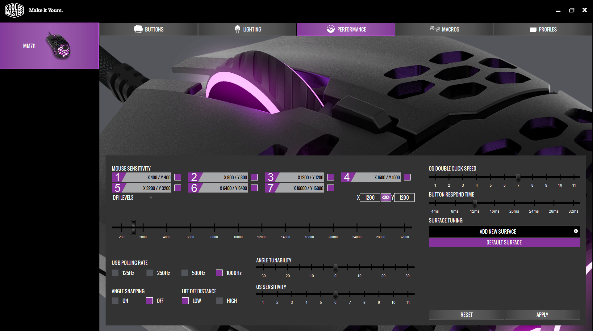 - Performance – adjust up to 7 DPI stages, control lift-off distance, angle snapping and more.