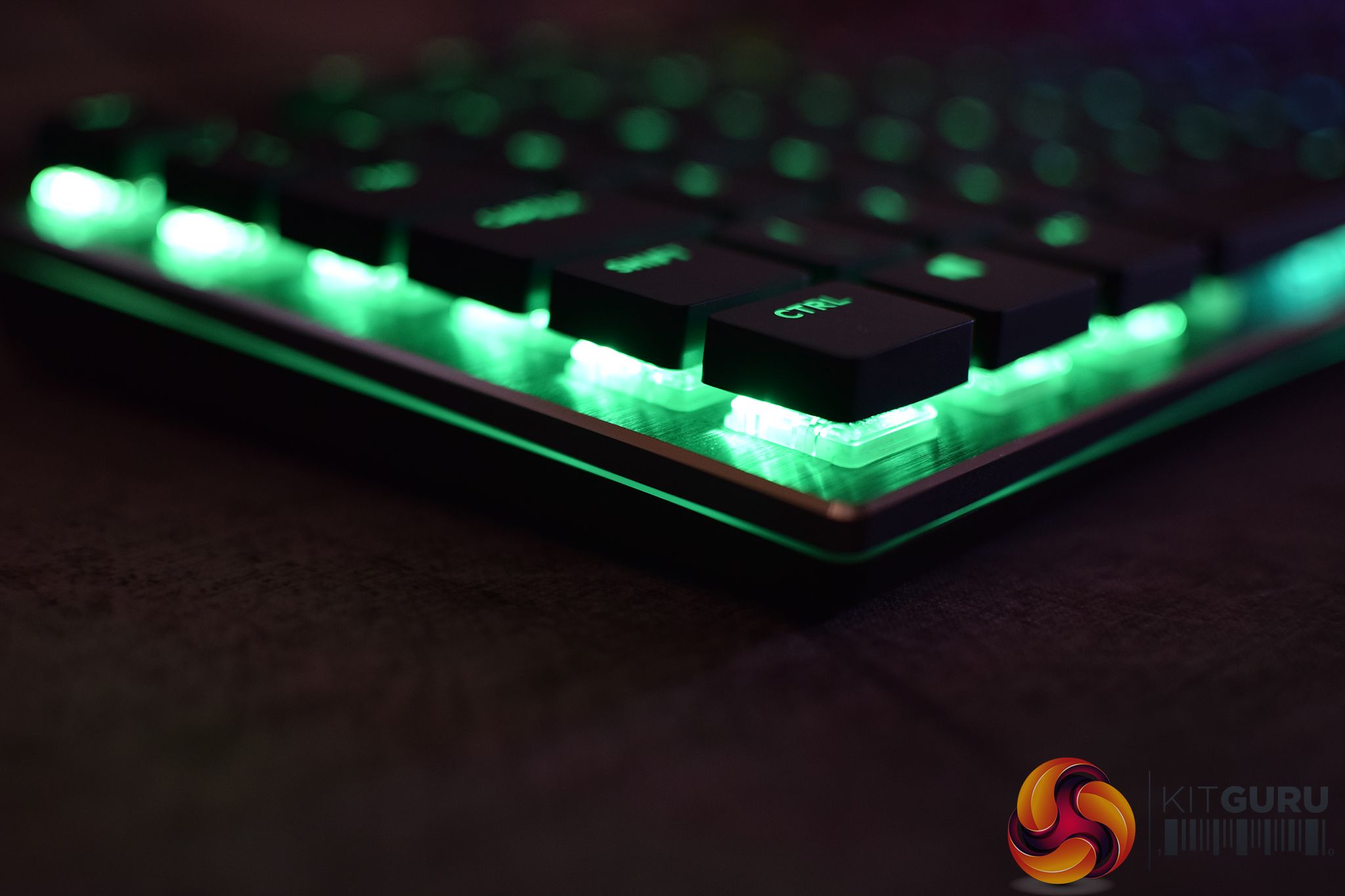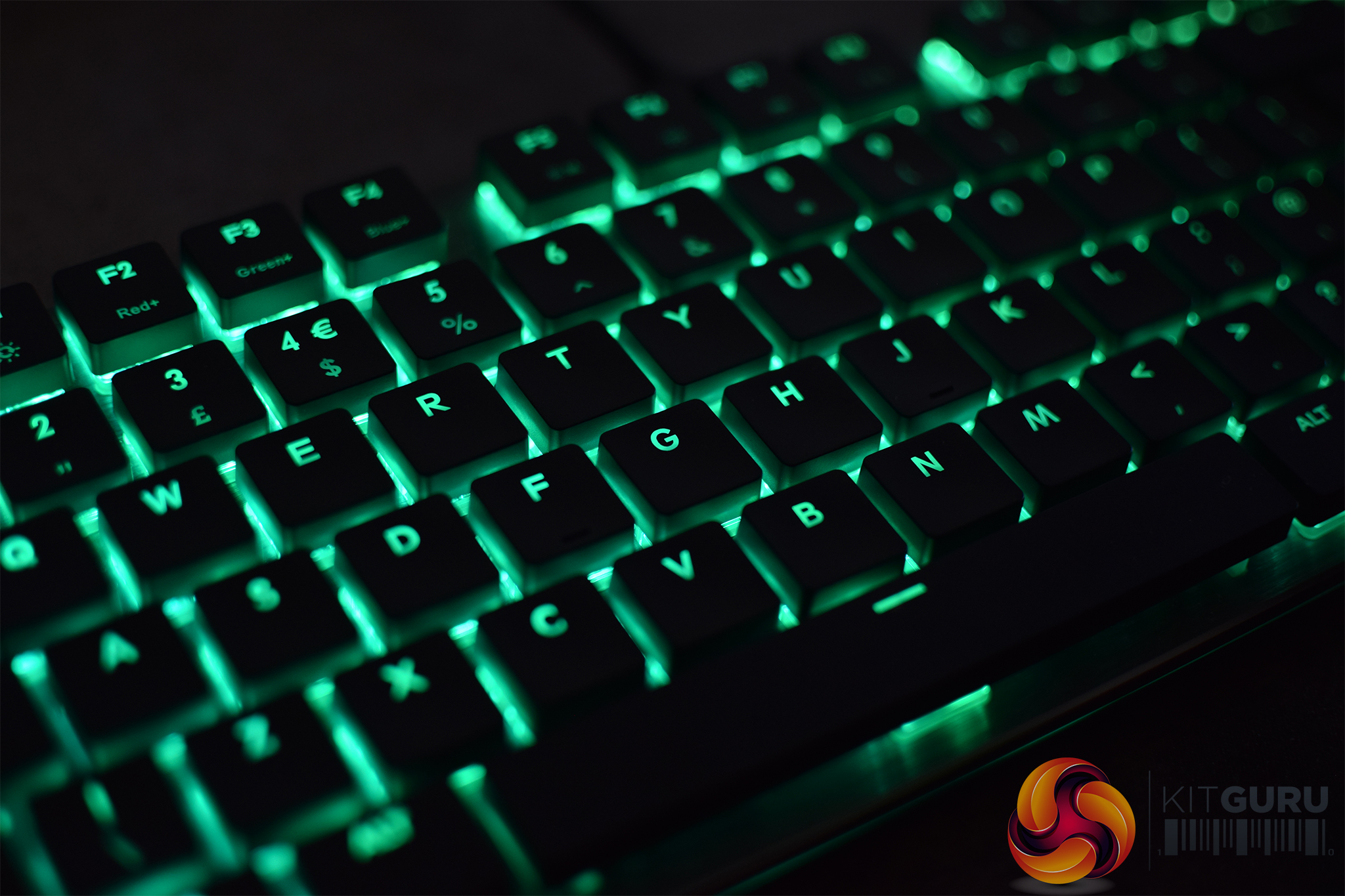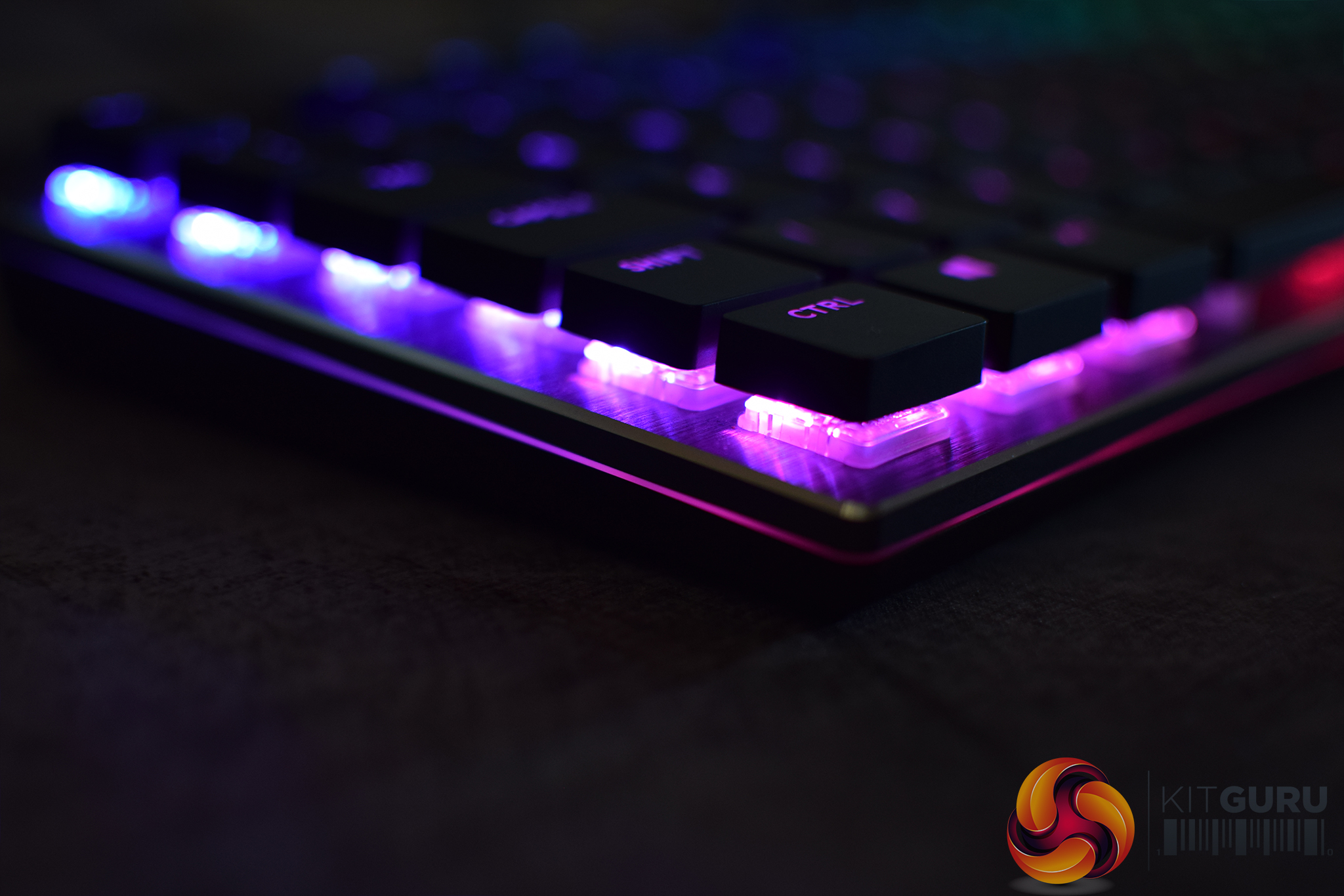 Now, as for the lighting, I have to say Cooler Master's per-key implementation looks really good. There's a range of effects to choose from – including rainbow wave, rain, ripple and so on – and overall brightness is good. The LEDs are still positioned at the top of the switches, so the small secondary icons on the functions keys aren't lit too well, but they are still legible.