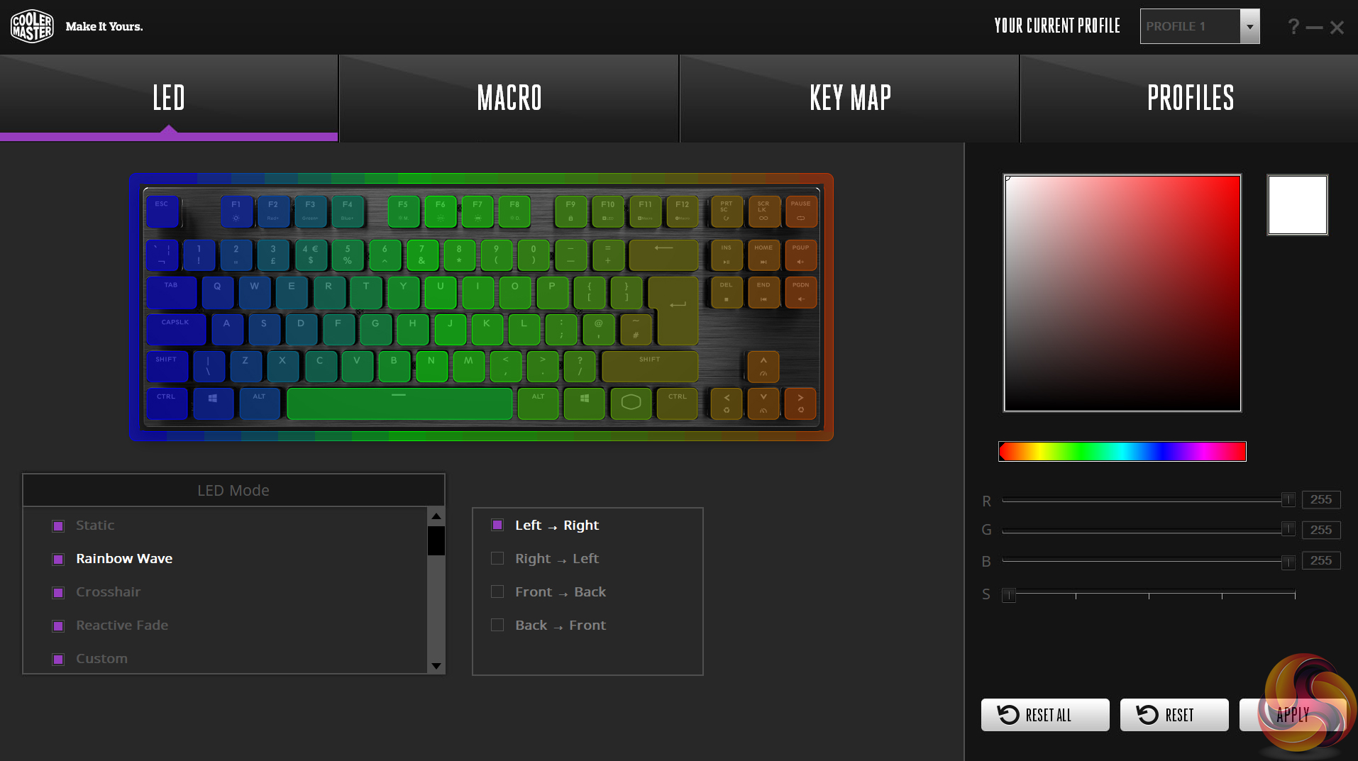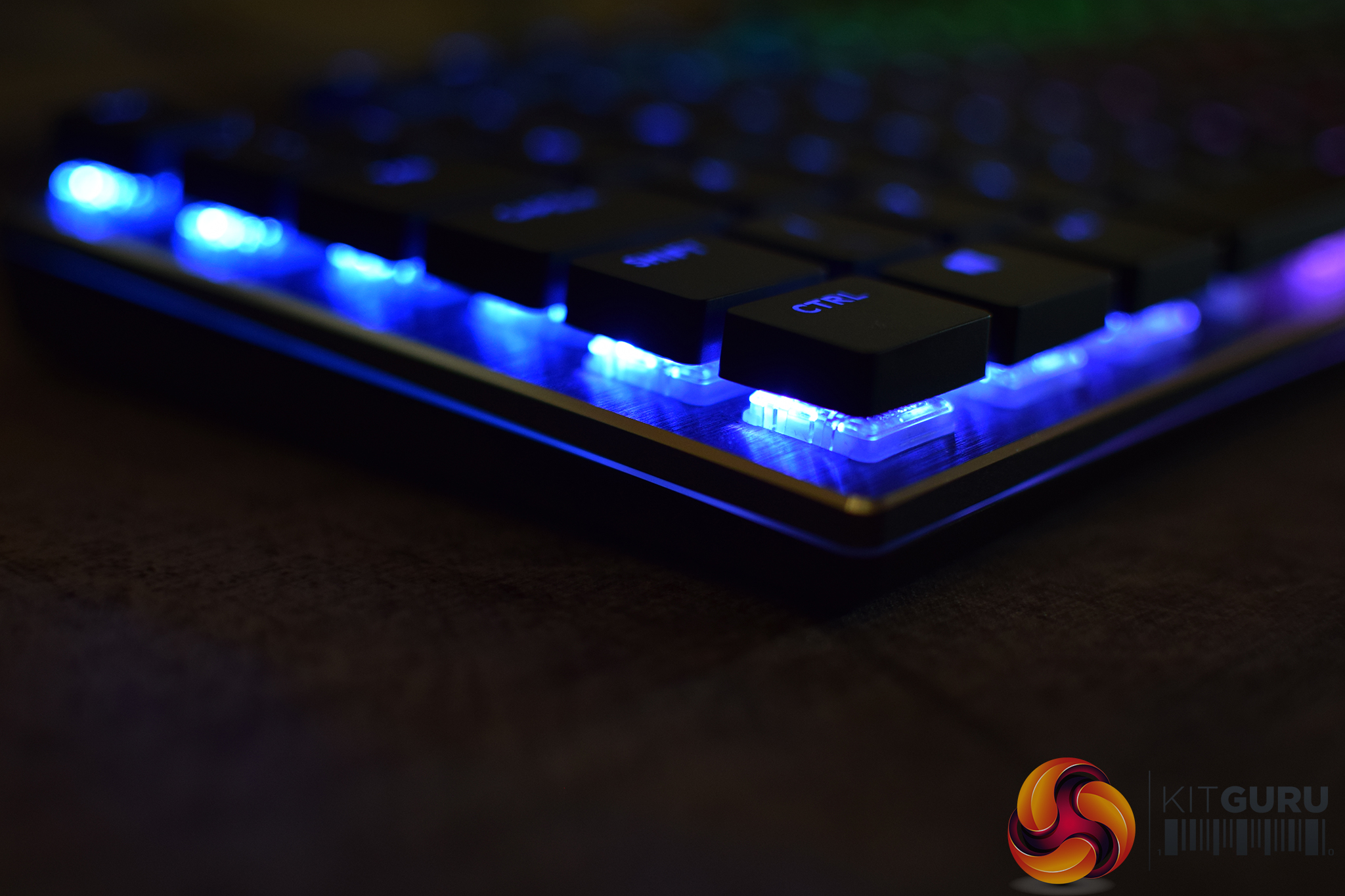 One thing that has baffled me for years about Cooler Master keyboards, however – and I am still at a loss as to why this has not yet been implemented – is why there is no master LED brightness control. You can manually adjust the different red, green and blue brightness levels, thus creating your own custom colour – but once you have found the desired colour, there is no on-board master brightness control. Thus, if you want to turn down the brightness, you are forced to use software, or go back and manually adjust each of the red, green and blue channels to get a lower brightness.