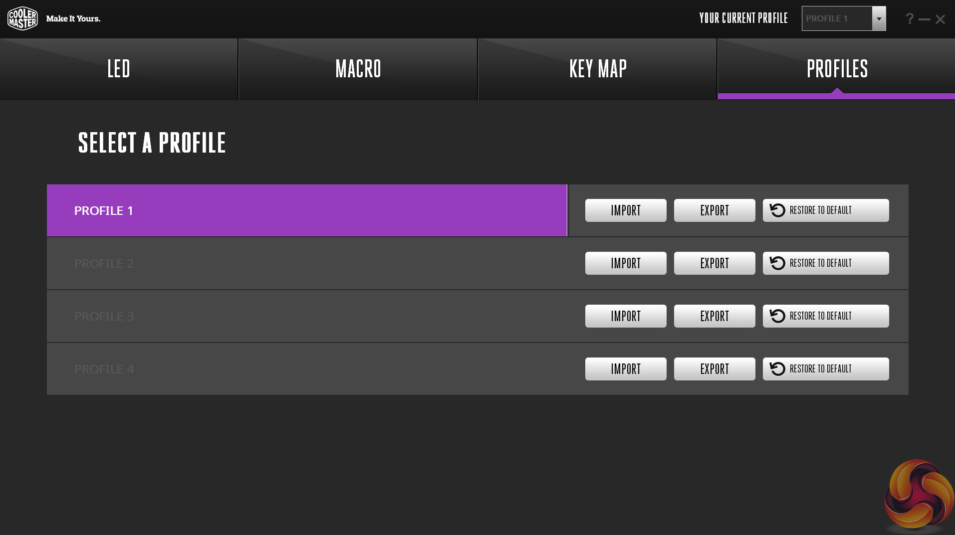 They're each pretty straightforward and self explanatory, with the LED tab giving users the choice between a number of lighting effects and the choice of 16.7m colours to choose from. Macro lets you record, well, macros, and then Key Map allows users to remap any of the 88 keys on the SK630. The Profiles tab allows users to configure up to 4 different profiles, while you can also export and import those profiles as well.