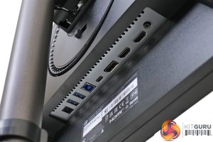 Round the back, the rear of the screen is made from matte black plastic. Those light grey/white-ish sections you can see are RGB diffusers, with one strip in each of the top corners, as well as a circular section around the central stand mount.