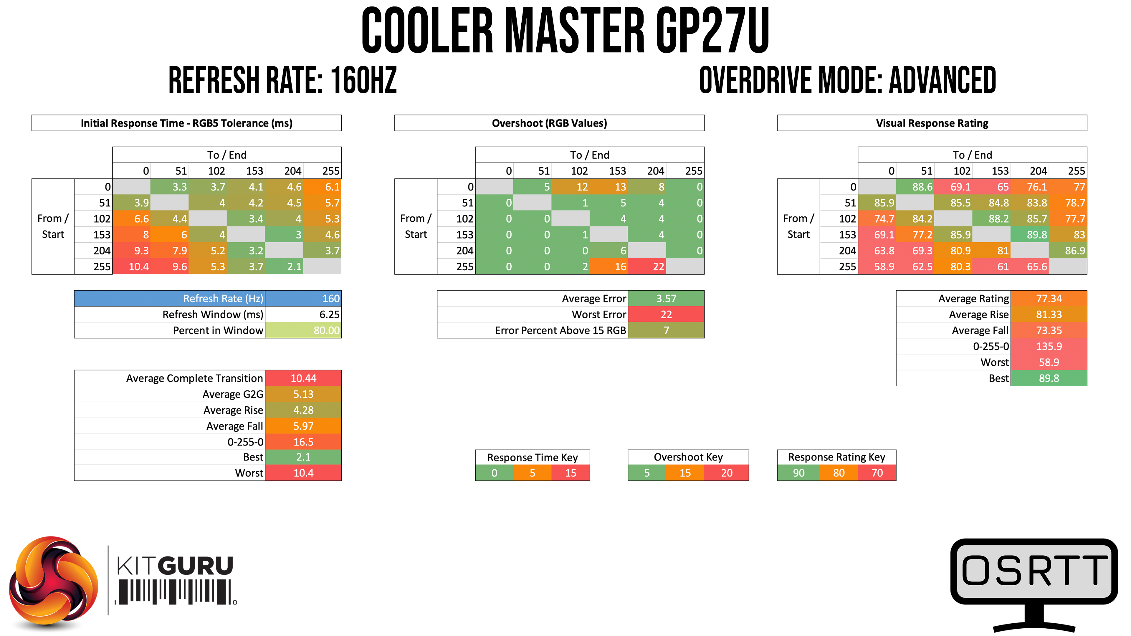 The Advanced mode is the most usable at 160Hz. Here we can see a decent average response time of 5.13ms, despite only a small amount of overshoot. The fall times do seem to be most problematic for the GP27U, particular transitions from RGB 255 (as seen in the bottom left corner) which hurt the average overall, but visually the performance is very acceptable.