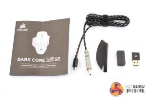 Inside, the only included manual is a small quick-start guide. However, there is also a 1.8m braided cable (for charging or for using the mouse fully wired), a replaceable side grip, the 2.4GHz wireless dongle, and a microUSB to USB Type-A adapter.