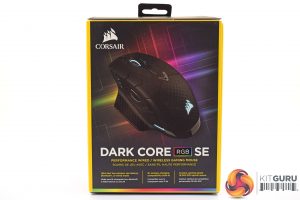 The Corsair Dark Core RGB SE ships in a very brightly-coloured box – to highlight the RGB capabilities of the mouse – while a large photo of the mouse is also positioned on the front.