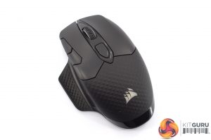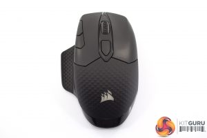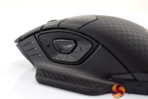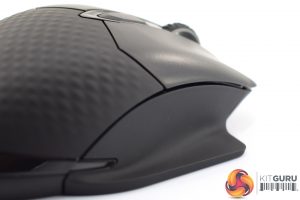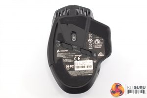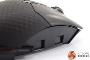 Moving over to the bottom-end of the mouse, the Corsair logo takes pride of place in the middle of the mouse. More interesting, though, is the dimpled plastic that is surrounding the logo – the whole section has this textured feel to it which is quite unique.