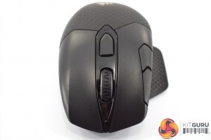 At the top of the mouse, we find the primary buttons, the textured scroll wheel and a single button just below that – which, by default, is for switching profiles. If you're wondering about a DPI switch button, there are actually two built into the side of the LMB – another unconventional move.