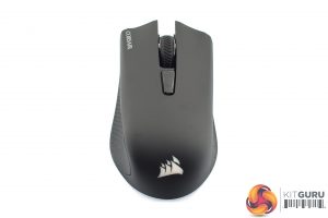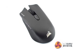 That means the Harpoon RGB Wireless is a small to medium sized mouse – the measurements are 115.5(L) x 68.3(W) x 40.4(H) mm – and it is an ergonomic shape for right handers. The main body of the mouse is made from a slightly textured plastic, with the Corsair logo at the bottom being the sole RGB lighting zone.