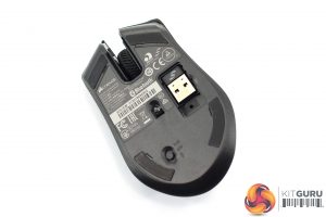 Just to the right of the sensor there is also a small compartment which lifts off to reveal the USB SLIPSTREAM wireless receiver. The mouse should be paired to the receiver already so you just need to switch the mouse on and it will work right out of the box.