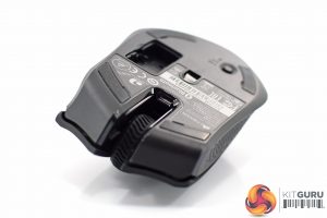 Turning to the underside of the mouse, the PMW 3325 sensor takes pride of place in the middle, with a total of four PTFE mouse feet positioned across the top and bottom edges. At the bottom we also find a small switch for turning the mouse to either the 2.4GHz or Bluetooth modes, or switching it off.