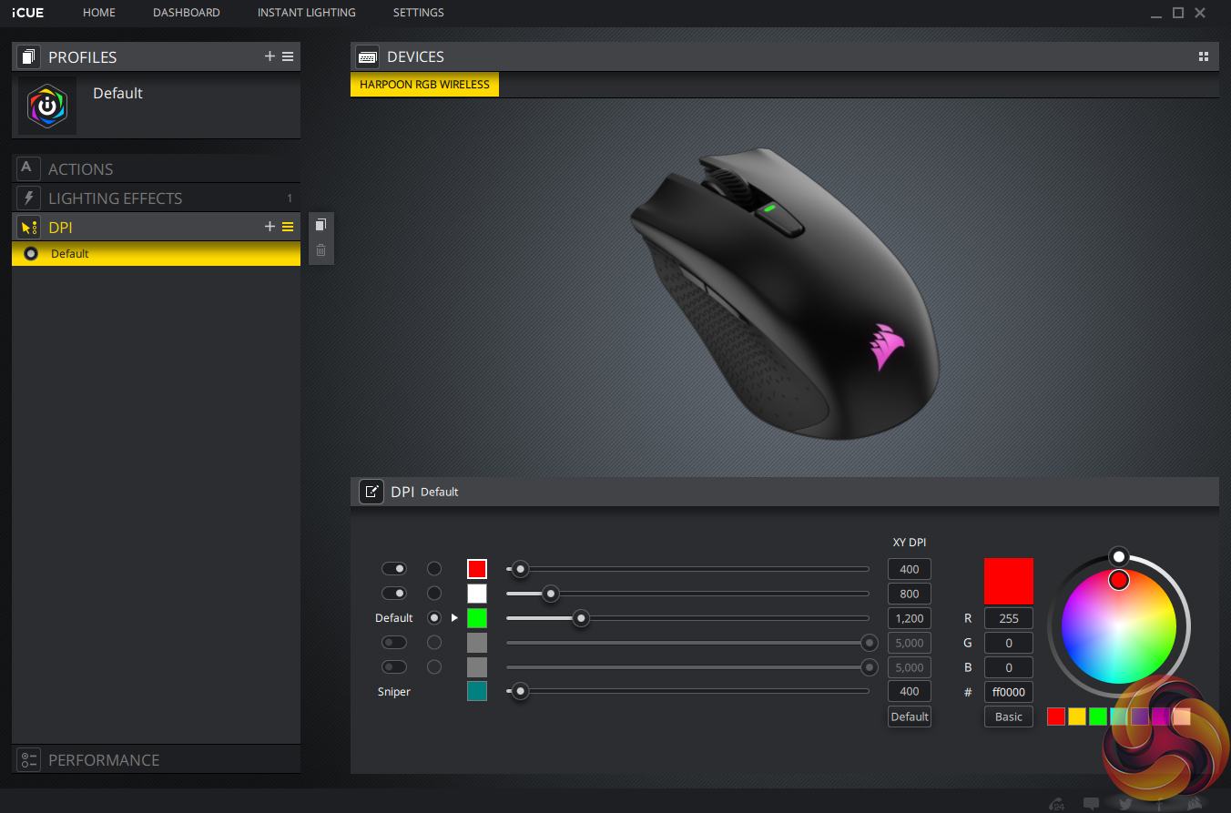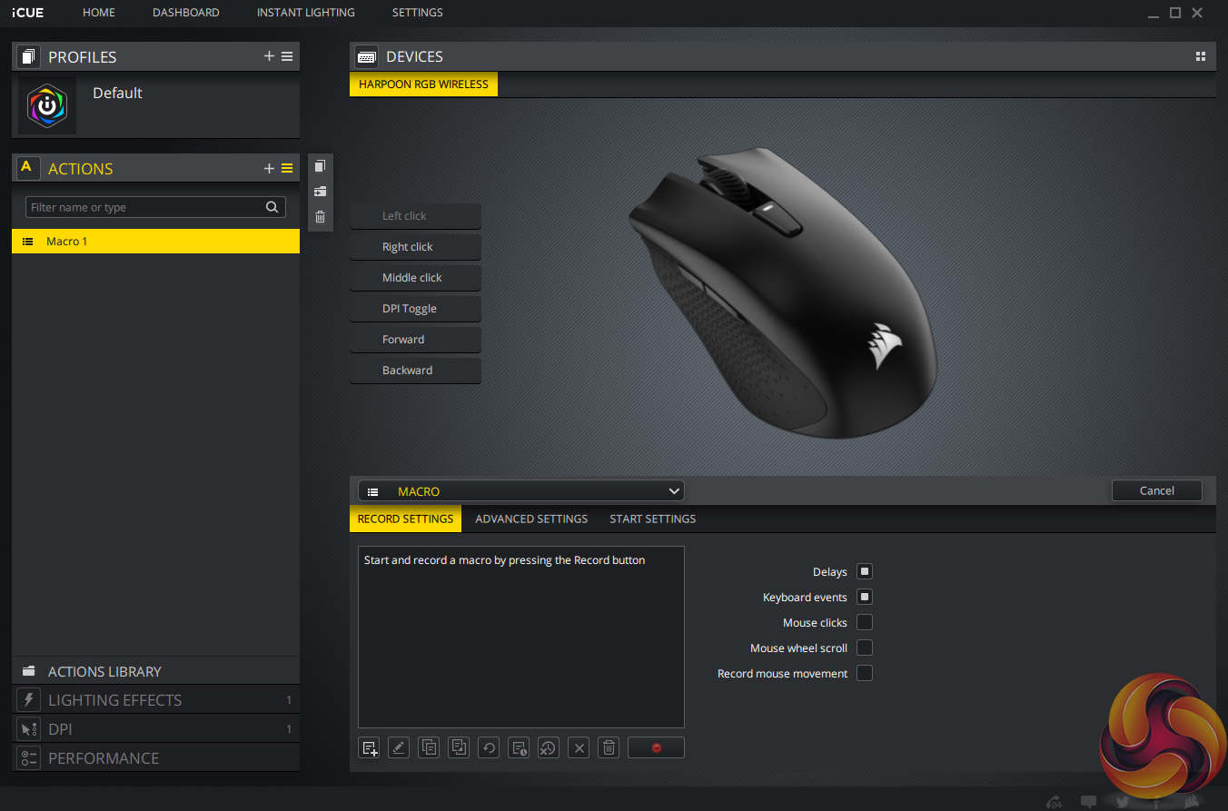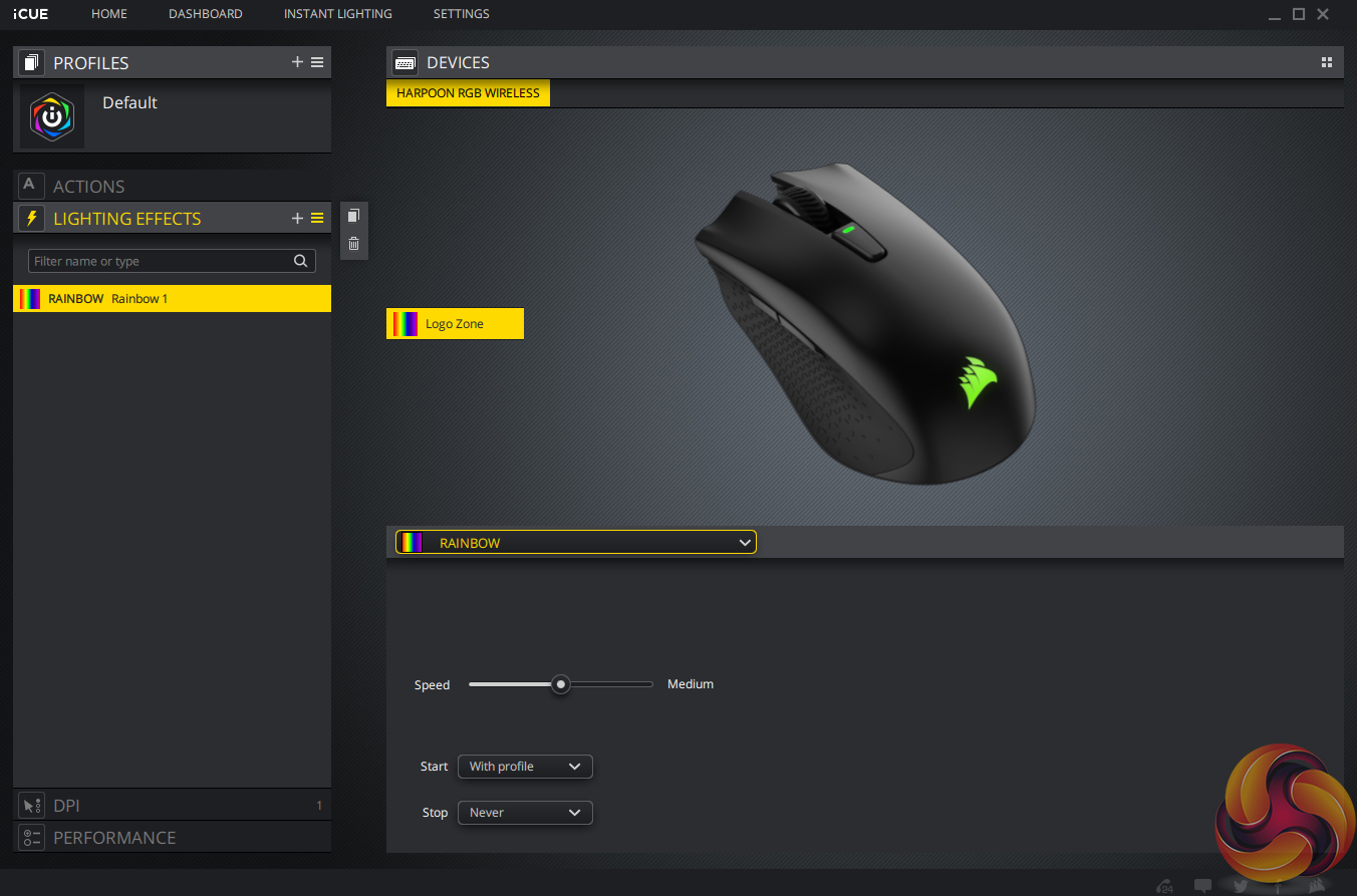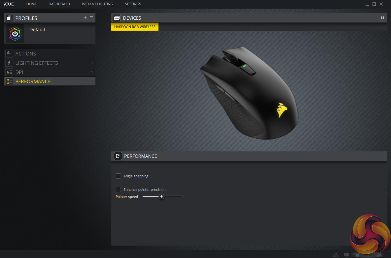In terms of what control you have over the Harpoon RGB Wireless, it's pretty standard. There's the ‘Actions' tab for creating macros and remapping buttons, while ‘Lighting Effects' gives you a number of presets to choose from to control the RGB illuminated zone on the mouse.