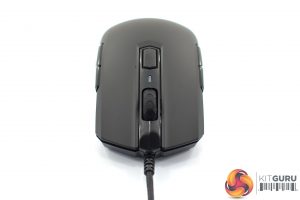 The front of the mouse houses the textured rubber scroll wheel as well as a single DPI button, with an LED indicator accompanying it. The primary buttons form part of the mouse's main shell – meaning they are not separate/split trigger buttons.