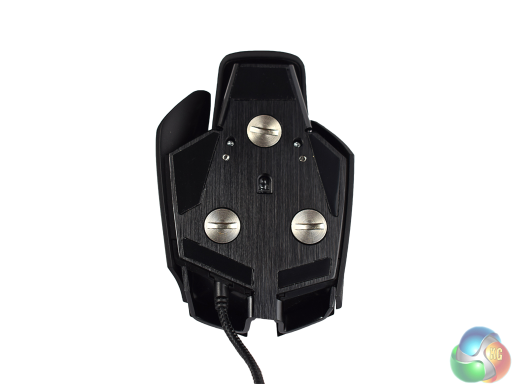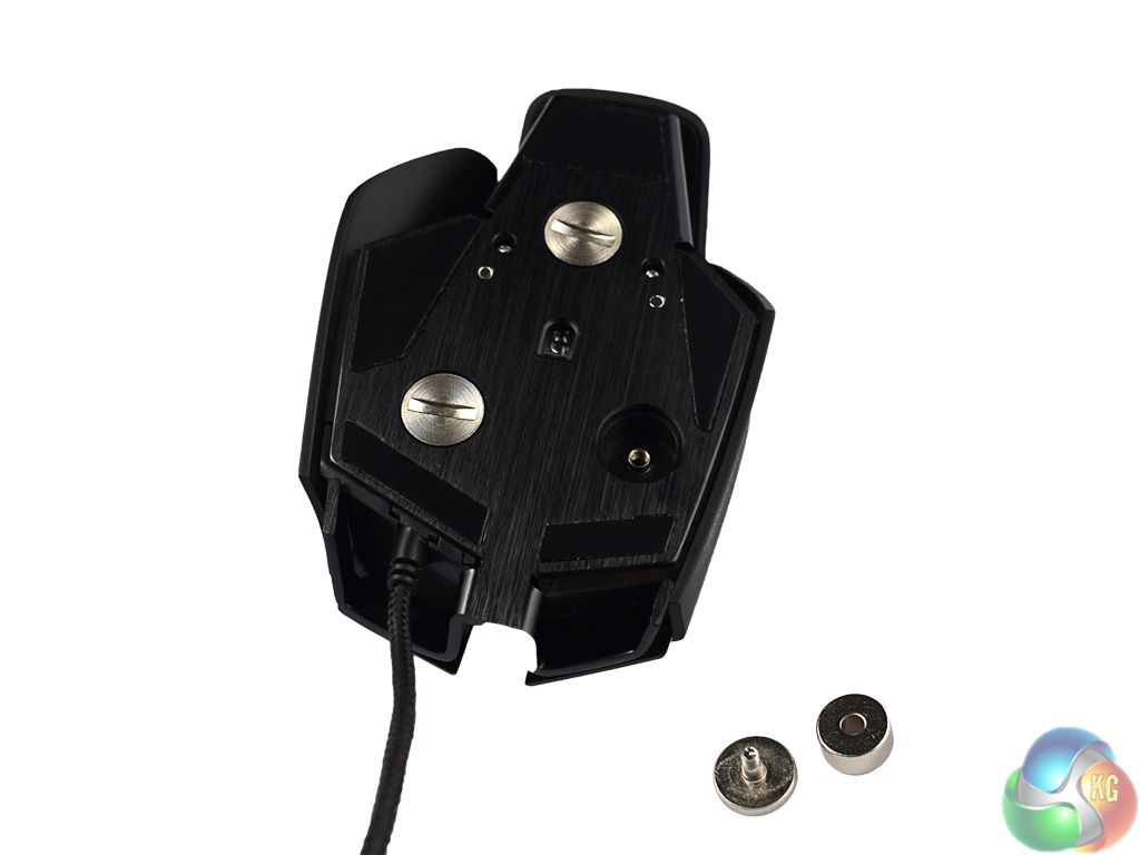 A brushed aluminium unibody design gives the M65 Pro a premium feel, and certainly helps keep it sturdy. Above you can see the screws on the base of the mouse, each of which pops out to reveal a 4.5g weight. Including screws, that gives a total weight adjustability of 20.5g, as the M65 Pro is 115g with no weights and 135.5g with weights.