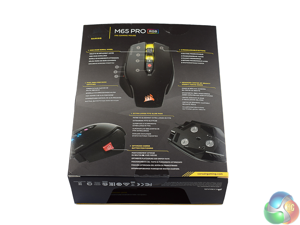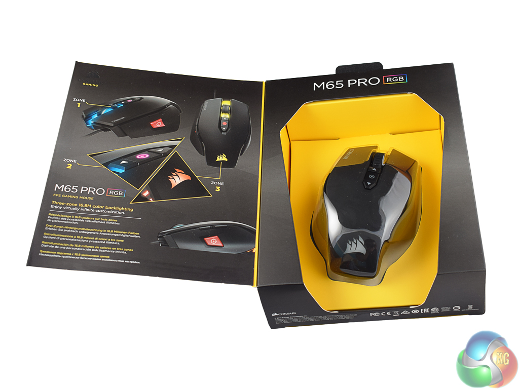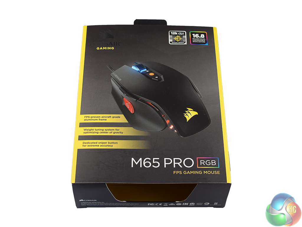 The Corsair M65 Pro ships in an attractive black box, with yellow accents.