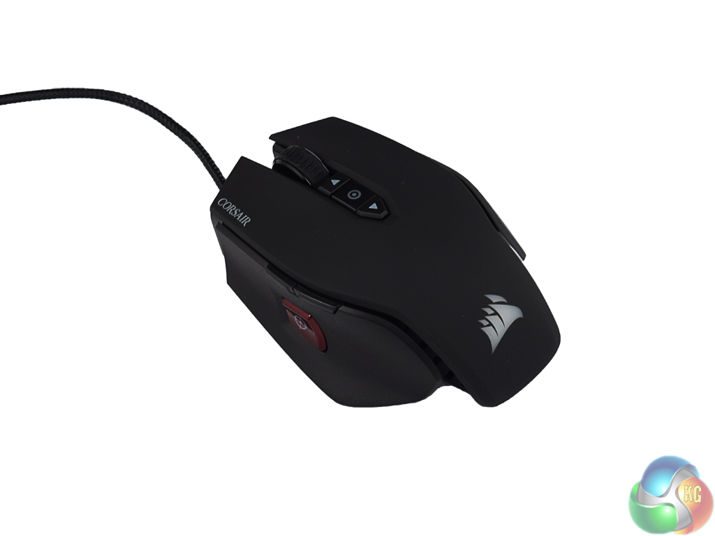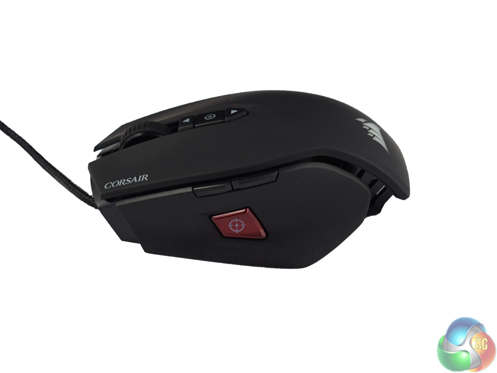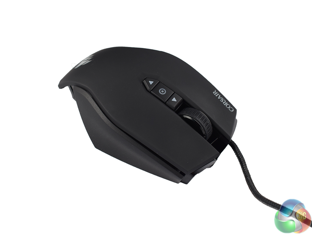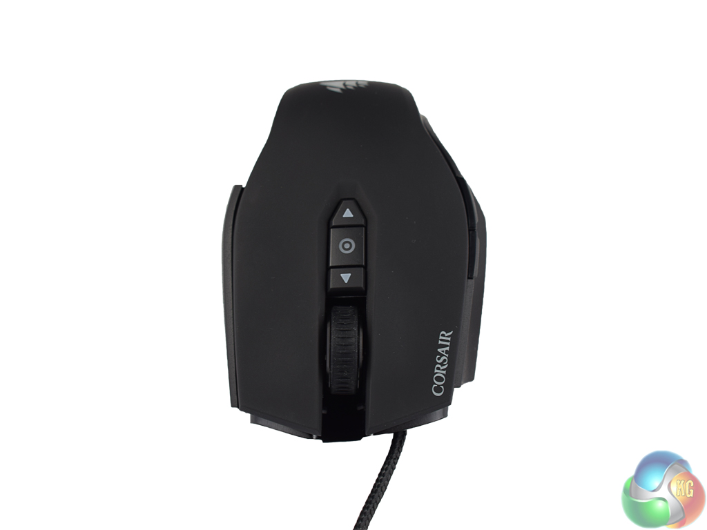 At the top of the mouse are two DPI switches – one for increasing the DPI, the other for decreasing DPI. Above these switches is the mouse wheel, which lights up along with the Corsair logo at the bottom of the mouse. On the next page we assess how the RGB lighting performs.