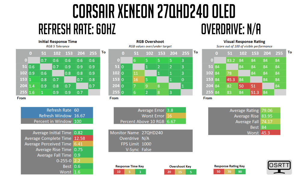 Monitor response time testing is a new addition to our reviews, where we use the Open Source Response Time Tool (OSRTT), developed by TechTeamGB. This measures grey-to-grey response times and presents the results in a series of heatmaps, the style of which you may be familiar with from other reviews.