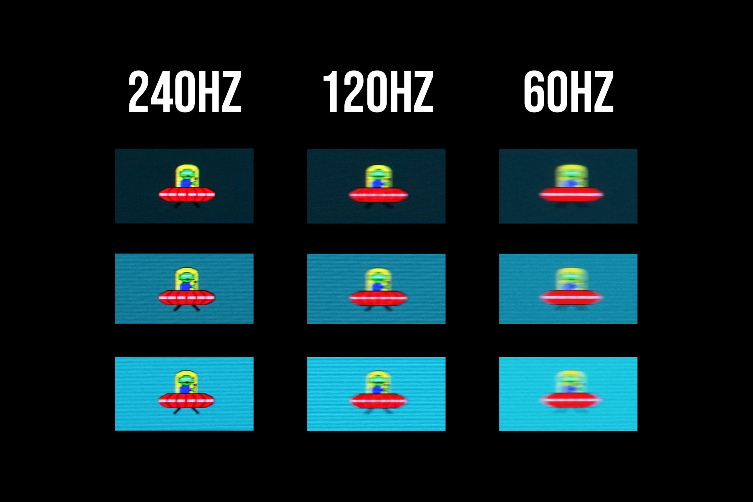 That's illustrated by the above pursuit camera images, using the Blur Busters UFO test. There's a noticeable increase in clarity at 240Hz, even compared to 120Hz, while 60Hz looks distinctively less lucid – despite the response times being near-enough identical at all three refresh rates.