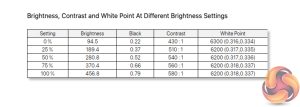 Brightness levels are very solid too. We see a peak reading of 466.6 nits which should be enough for almost everybody – I typically used the screen at 60% brightness. Contrast isn't great however, with a peak of just 630:1, something we also observed with the 32QHD165. I have seen reports that the SpyderX unit can under-report contrast, but for an IPS panel this was never going to be a particular high-point. We can also note a slightly warm white-point at 6100K – it's not miles off the 6500K ideal though.