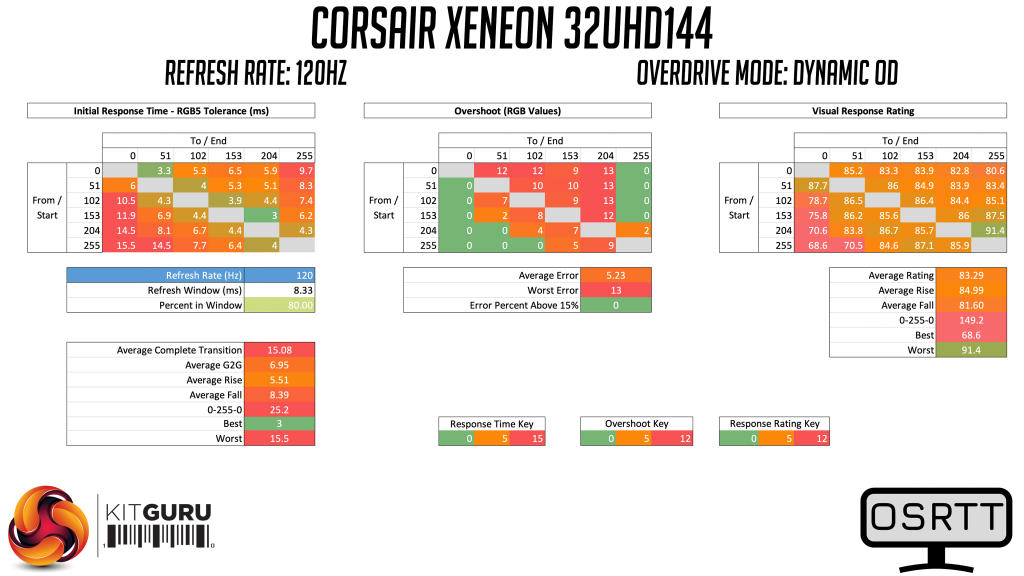Monitor response time testing is a new addition to our reviews, where we use the Open Source Response Time Tool (OSRTT), developed by TechTeamGB. This measures grey-to-grey response times and presents the results in a series of heatmaps, the style of which you may be familiar with from other reviews.