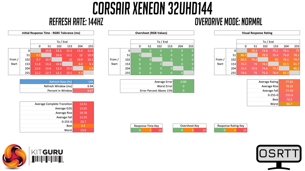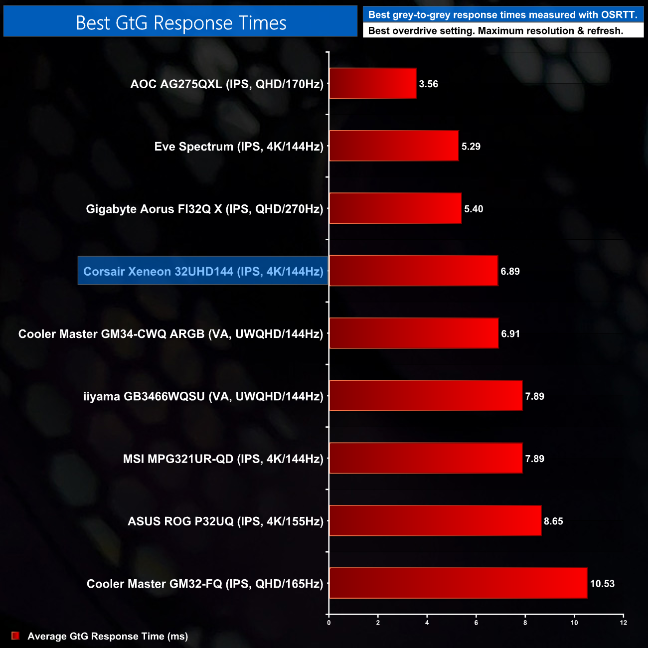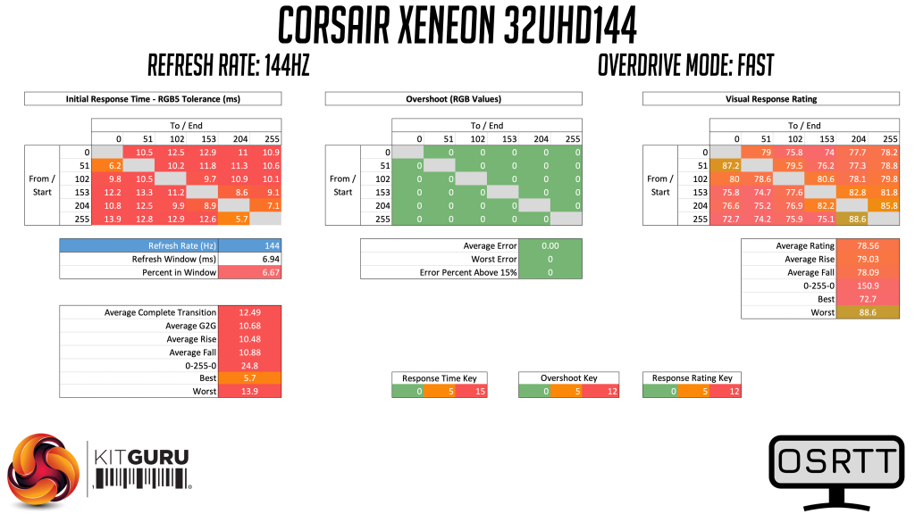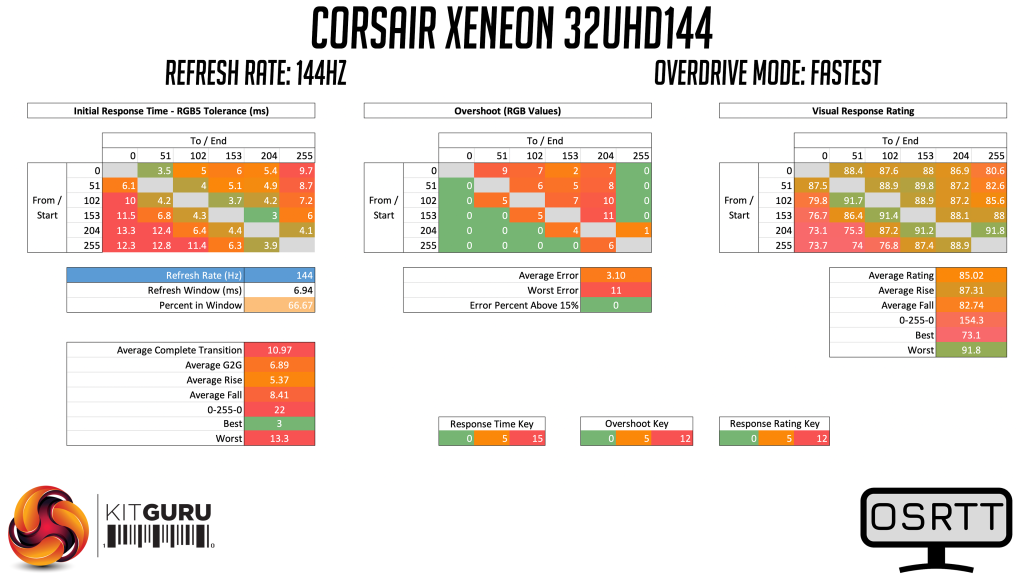 Taking a quick look at the relative performance using the 32UHD144's best result (the Fastest overdrive mode at 144Hz), it's response time of 6.89ms is certainly decent. We still need to test more screens before this chart is a bit more conclusive, but compared to the ASUS PG32UQ and MSI MPG321UR-QD – two direct competitors for the 32UHD144 – it is the Corsair screen coming out on top, proving about 1ms faster on average than the MSI screen.