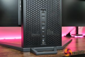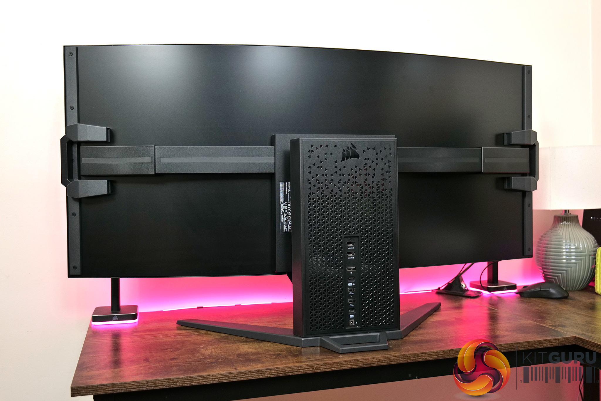We'd guess that the flex mechanism is the reason why Corsair has done something a bit different with the I/O. All of the ports are stacked vertically on top of each other, with the following connectors available: 2x HDMI 2.1, 1x DisplayPort 1.4, 1x USB-C with 30W Power Delivery and DP Alt mode support, 2x USB 5Gbps downstream, 1x USB-C 5Gbps upstream.