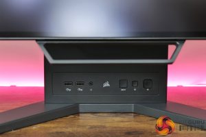 The front I/O also delivers another pair of USB downstream ports and a headphone jack, along with a 5-way joystick to navigate the OSD, a button to switch between the video inputs, and the power button.