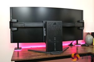 Ergonomic adjustments are sadly very limited, as we only get tilt from -7 to +15 degrees. This is due to the flex mechanism, and third party VESA mounts are not supported. Corsair did tell us they are working on a desk mount, but that won't be available until next year, and it's currently unclear how that would work.