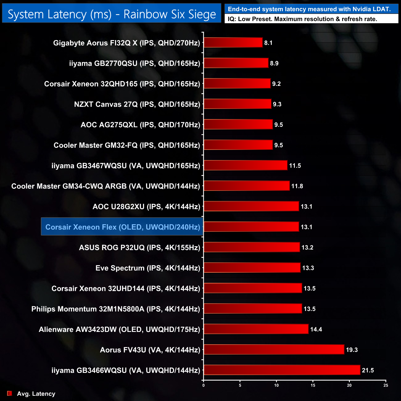 We also test overall system latency, with the Xeneon Flex seeing 13.1ms of latency. This is about 1.5ms higher than other 3440×1440 displays we have tested but it is absolutely nothing to worry about, and still proves marginally faster than the Alienware AW3423DW.