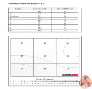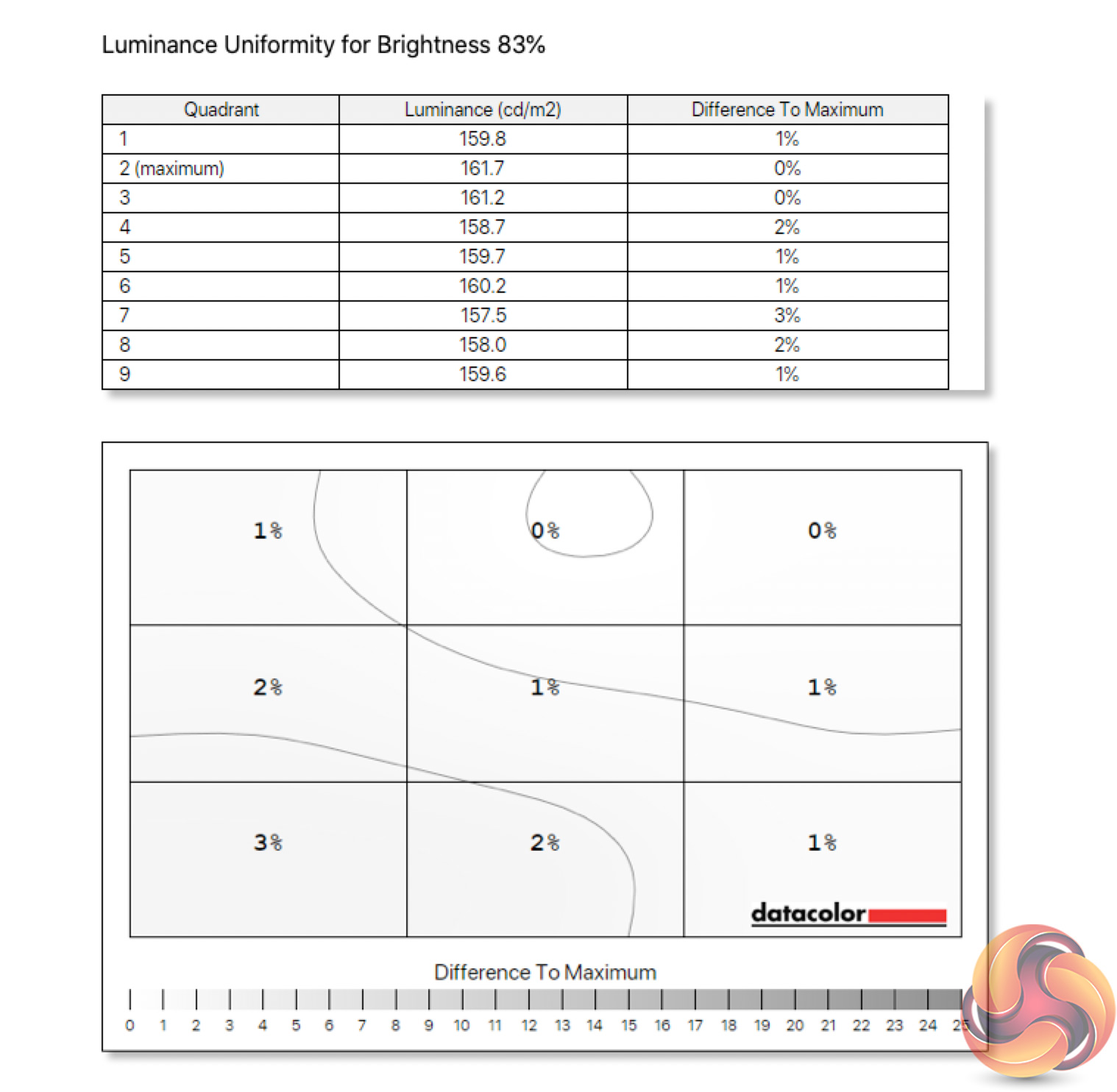 Similarly, luminance uniformity is exceptional. At most we see just 3% deviation, indicating incredible evenness of lighting across the panel – one of the clear benefits of OLED, as there's no backlight that needs to evenly illuminate the panel.