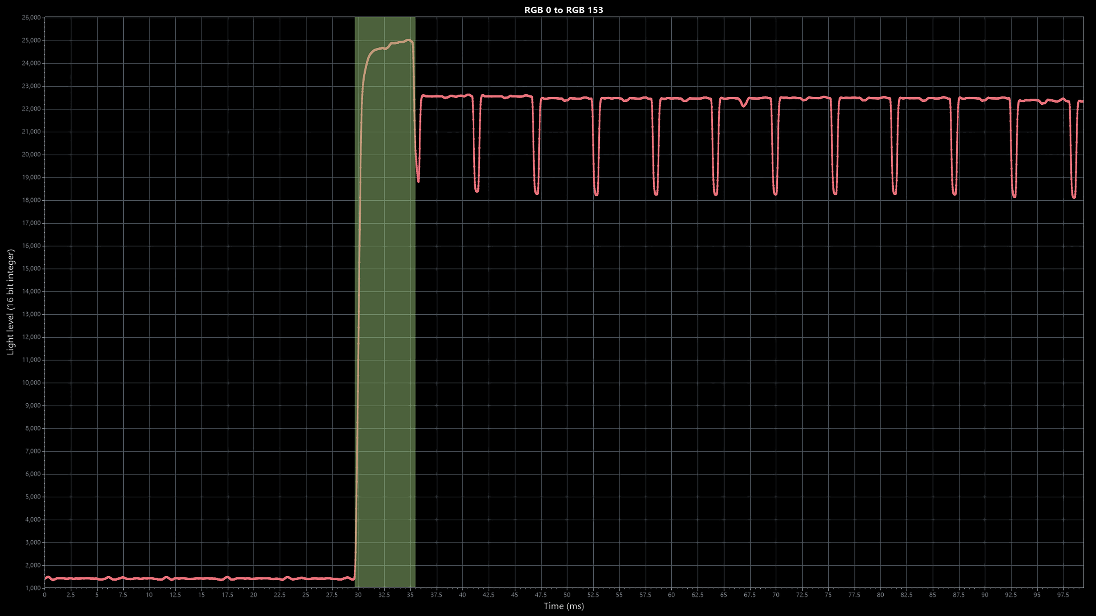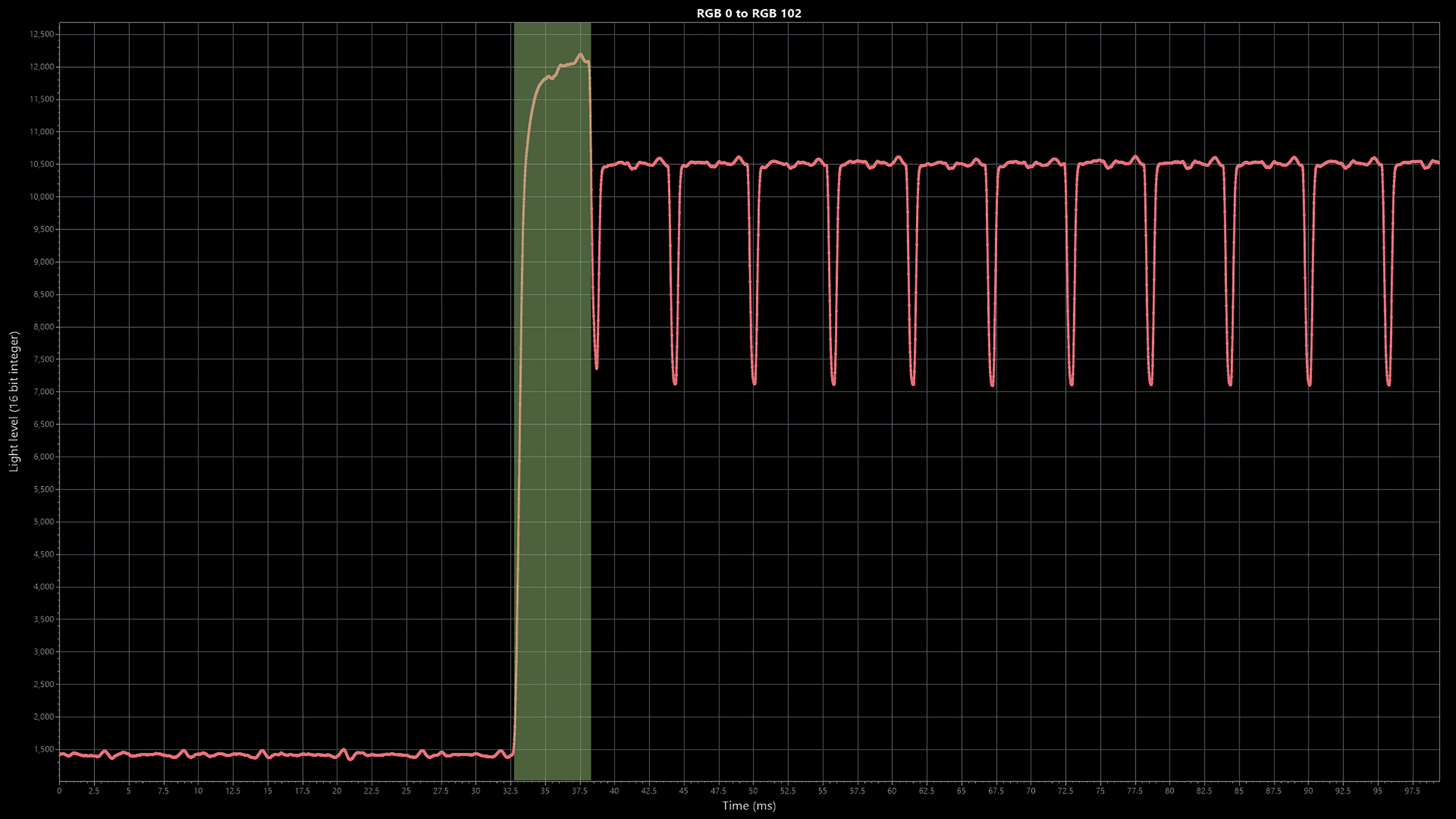 In both cases, we can see the light level shifting up from RGB 0 (a full black shade) and almost immediately transitioning up to its target. On the first frame however, there is a clear spike as the monitor overshoots its target, before it settles perfectly at the target by the next refresh.