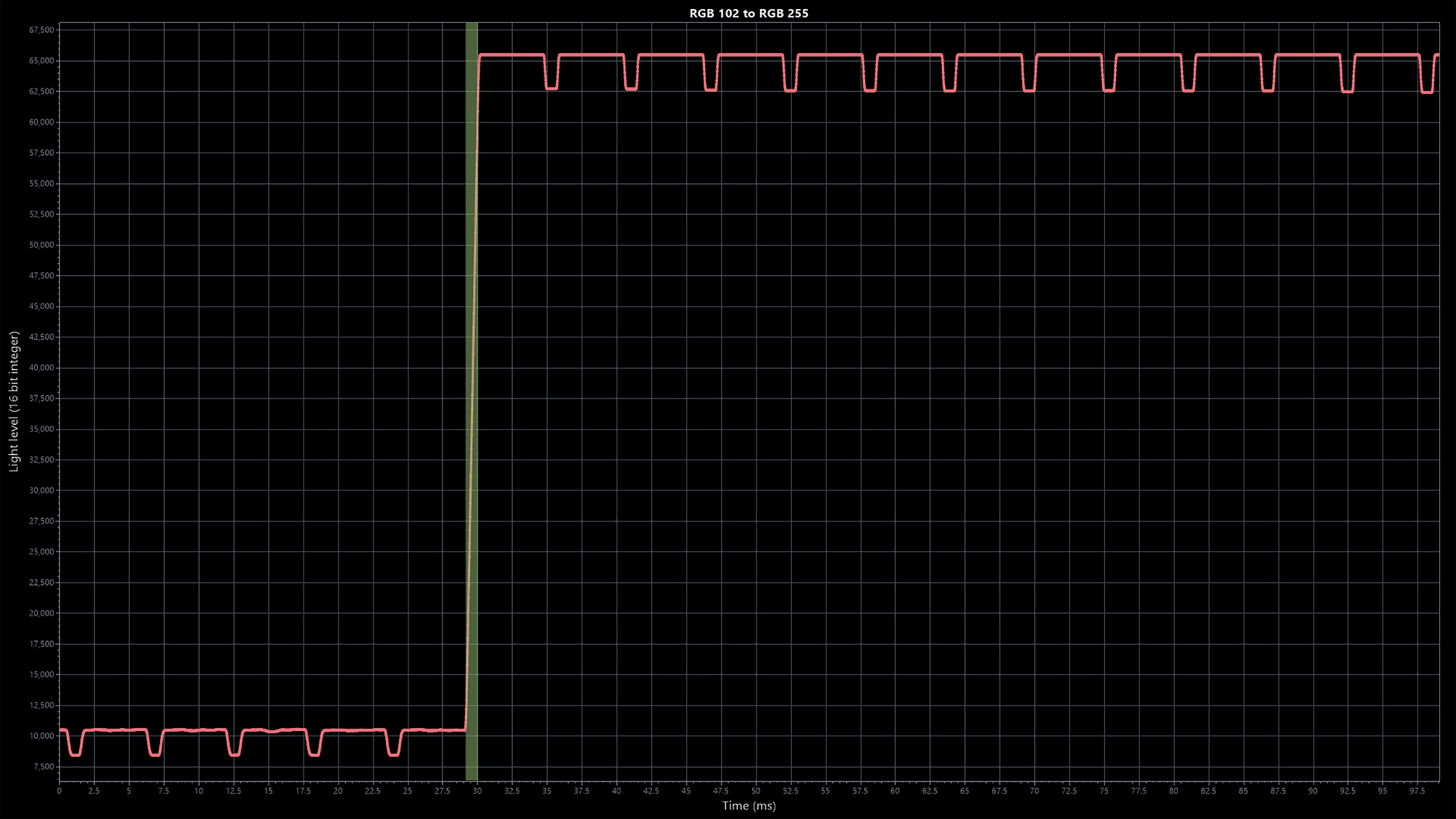 We can contrast that with this image, showing the transition from RGB 102 to RGB 255. This transition displays no overshoot as the monitor hits its target perfectly the first time around and stays there for the subsequent screen refreshes.
