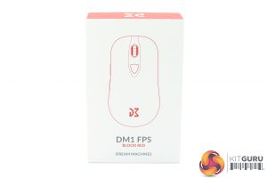 The DM1 FPS ships in a clean white box, with red accenting. A large drawing of the mouse itself dominates the front.