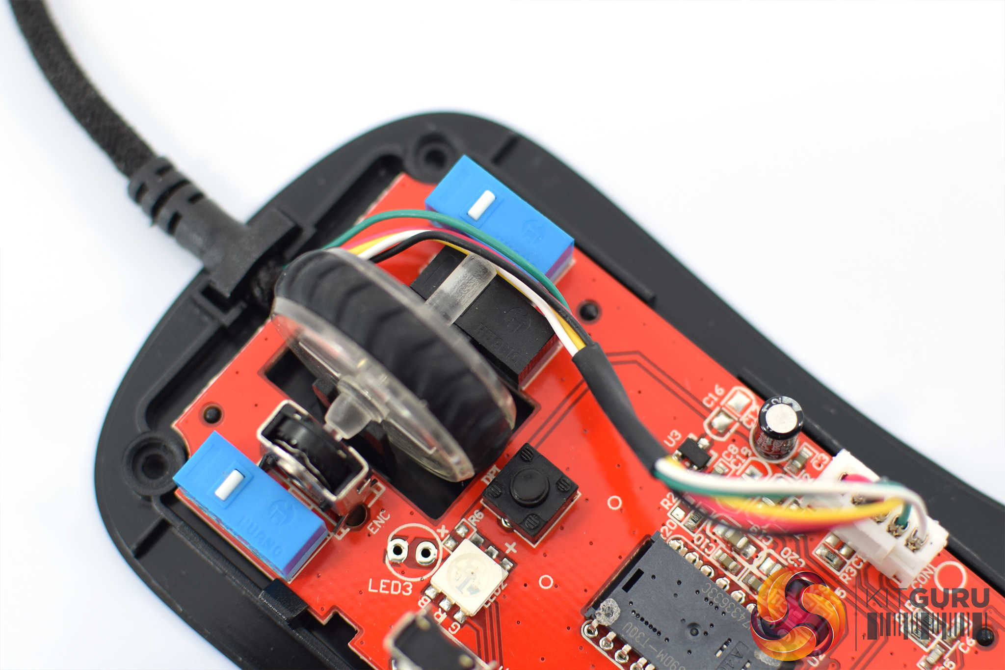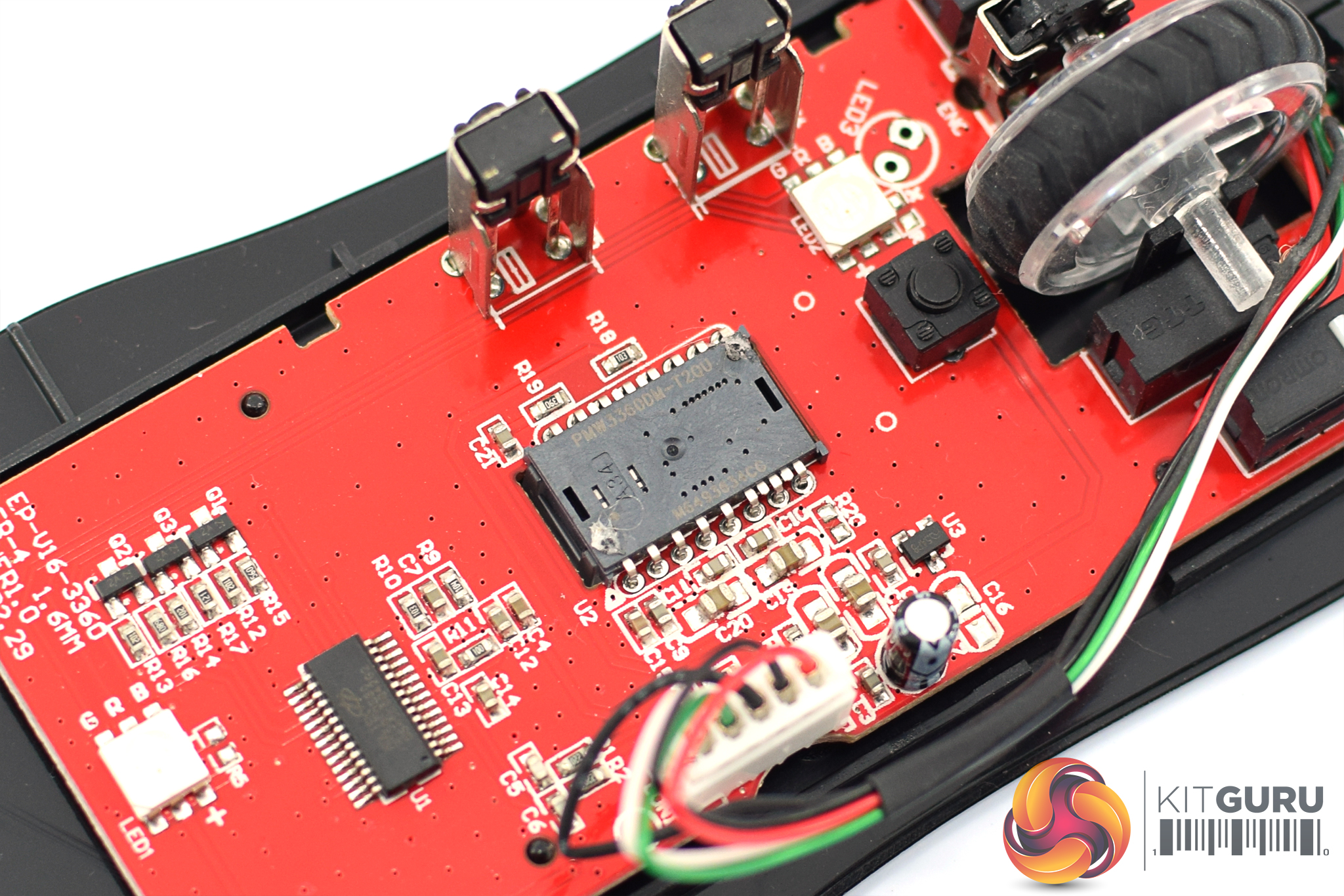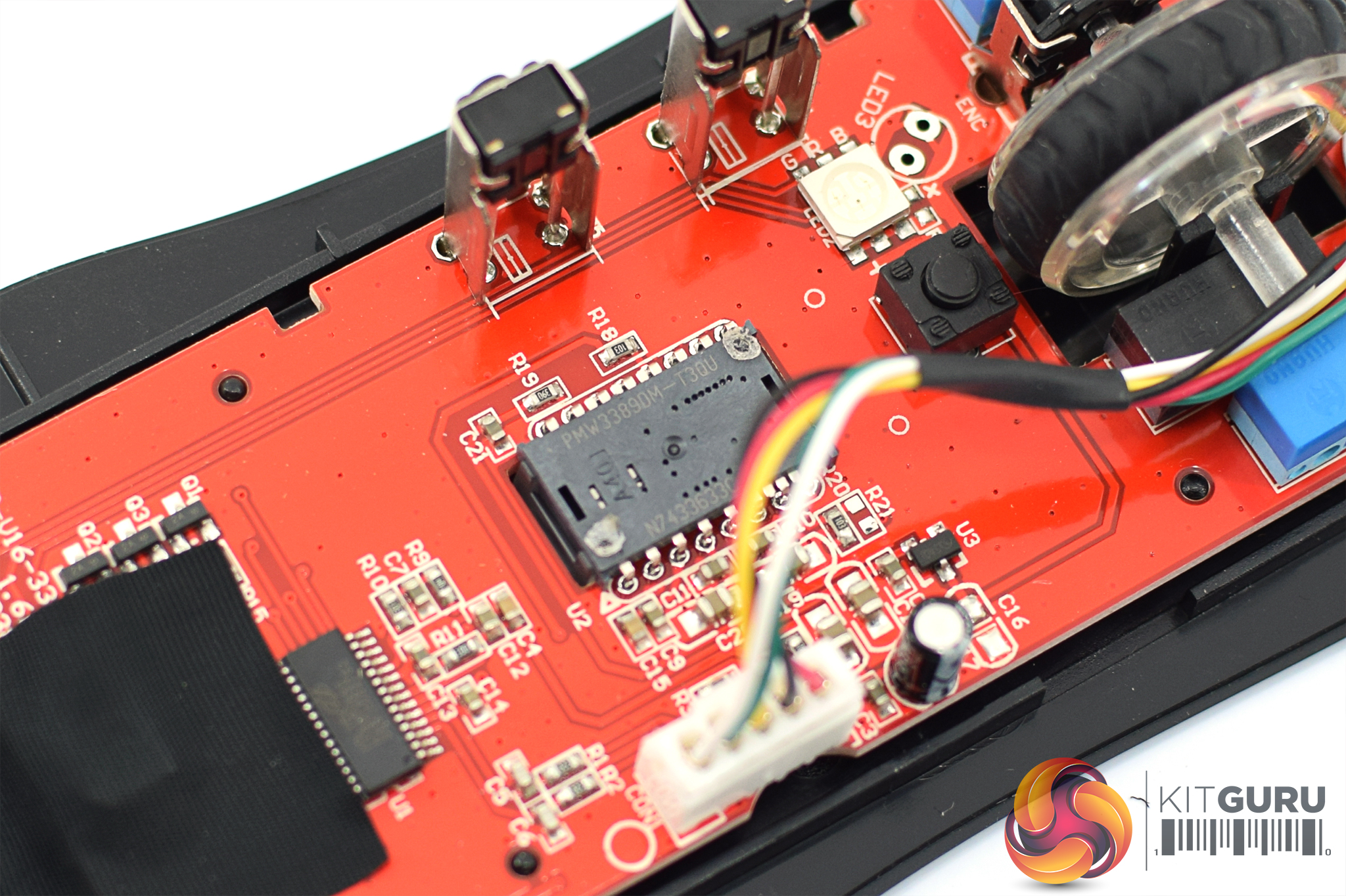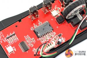 Turning the mouse over reveals three mouse feet – one larger one at the top, and two slightly smaller feet at the bottom. The PMW 3389 sensor sits in the middle of the mouse.