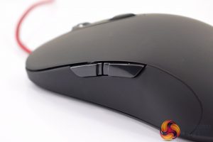 The scroll wheel is the second lighting zone, and just behind that we find a single DPI adjustment button. Either side of the scroll wheel are the two primary buttons – these use Omron switches rated at 20m clicks.