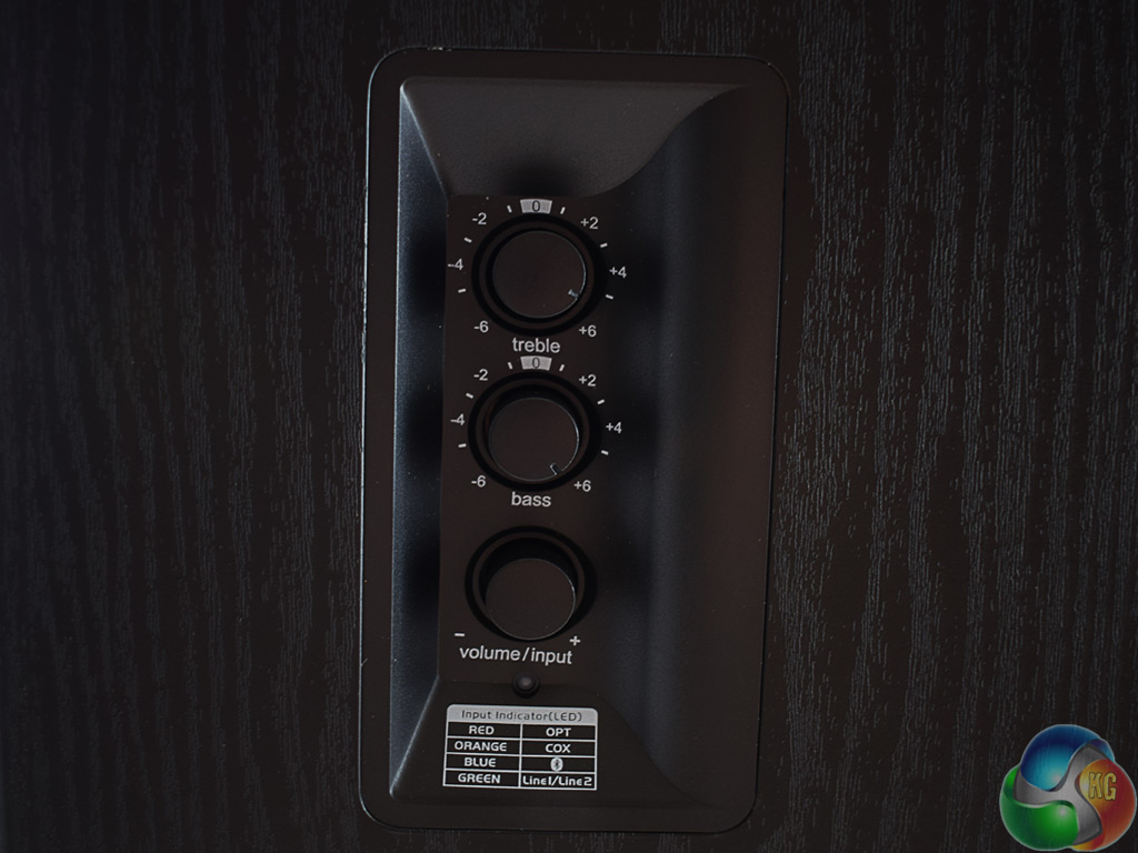 On the side of the right-hand speaker is the bass, treble and volume adjustment options. Bass and treble can be tuned to +/- 6, allowing a good degree of flexibility for each user to change the sound as they wish.