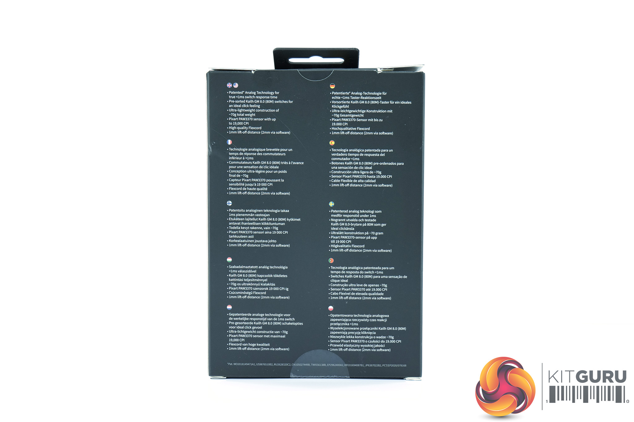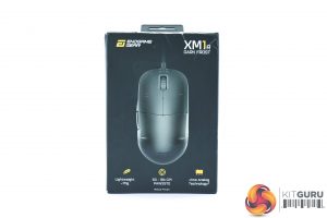 The Endgame Gear XM1r ships in a fairly plain black box, with an image of the mouse visible on the front, alongside some product branding and three key features. On the back we find some multi-lingual product information.