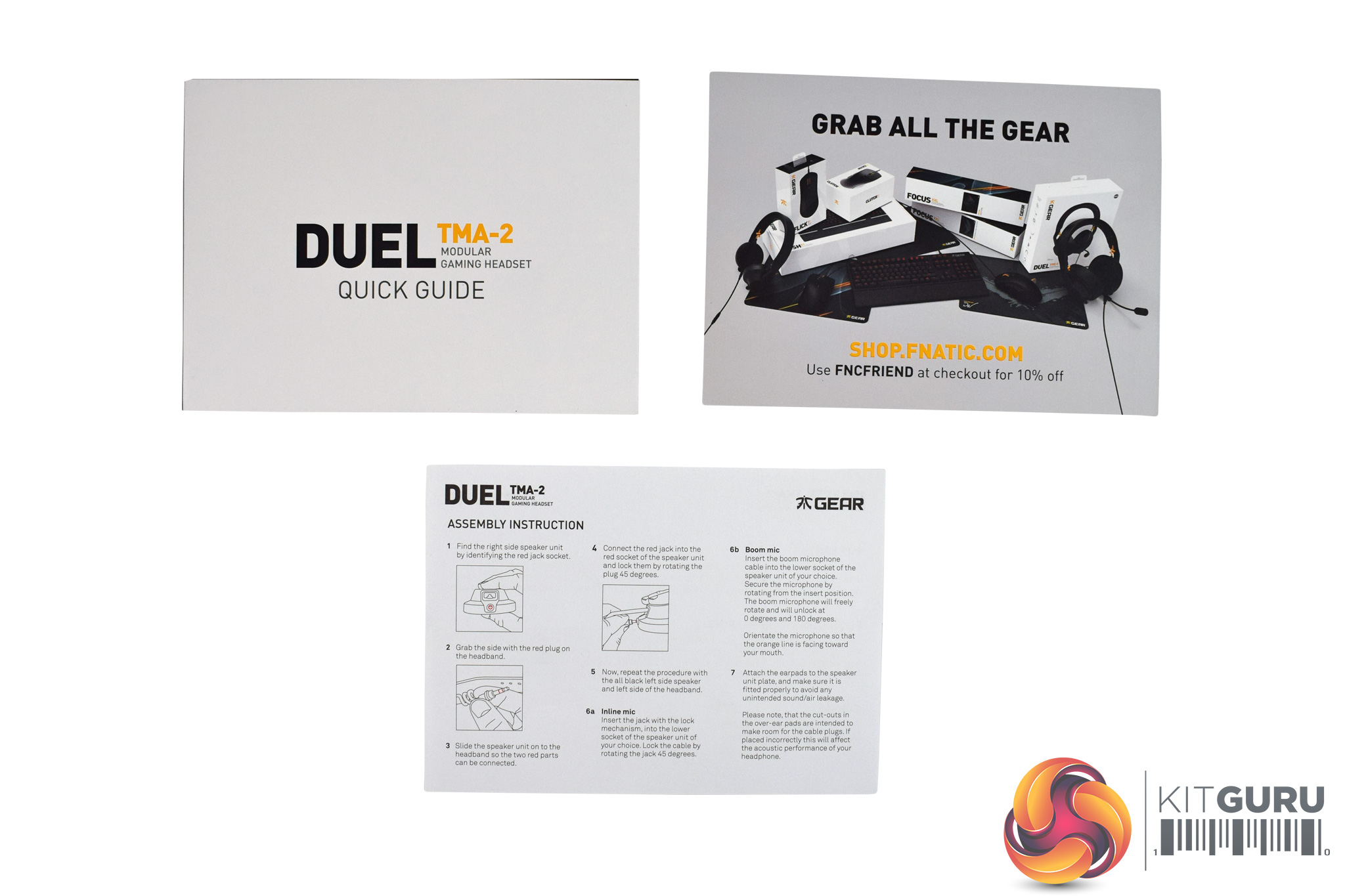 Inside, there are three small booklets: one is a quick-start guide, one is a small assembly guide, while the last leaflet gives you a 10% discount at Fnatic's online store.