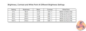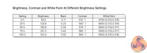 More positive however is the white point, which is bang on at 6500K when tested at 50-100% brightness, and only deviates from that target by 200K at 0% brightness.