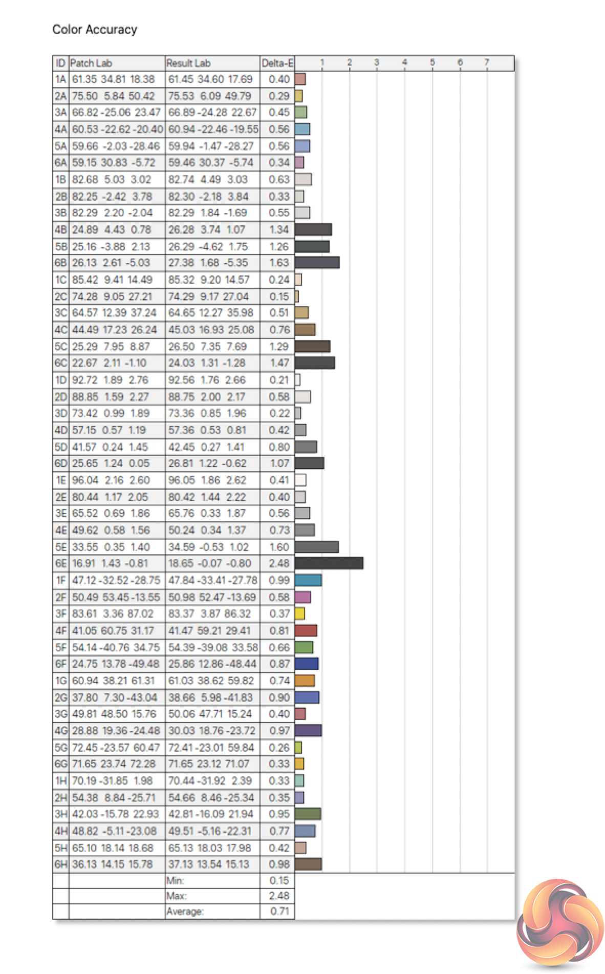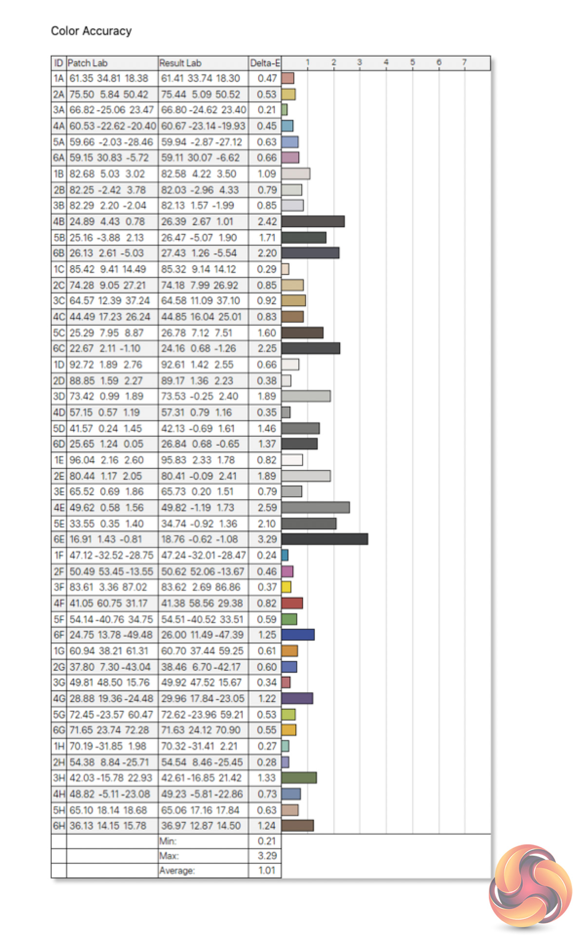 - The colour accuracy, expressed as a Delta E ratio, with a result under 3 being fine for normal use, and under 2 being great for colour-accurate design work.