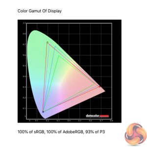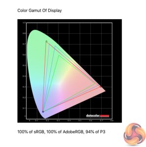 Kicking off our panel testing with a look at the display's gamut. Here we see 100% sRGB, 100% AdobeRGB and 94% DCI-P3 coverage – all excellent results for a gaming display, though arguably we would expect this considering the price point.