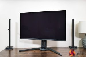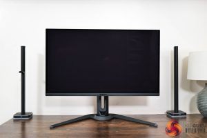 As for the I/O, this is split across two sections on the back of the monitor. One half houses the video inputs, with 2x HDMI 2.1, 1x DisplayPort 1.4 and 1x USB-C that supports DP-Alt mode and 18W power delivery. In the other half we find headphone and mic jacks, one USB-B upstream which feeds two Type-A downstream ports, as well as the power input.