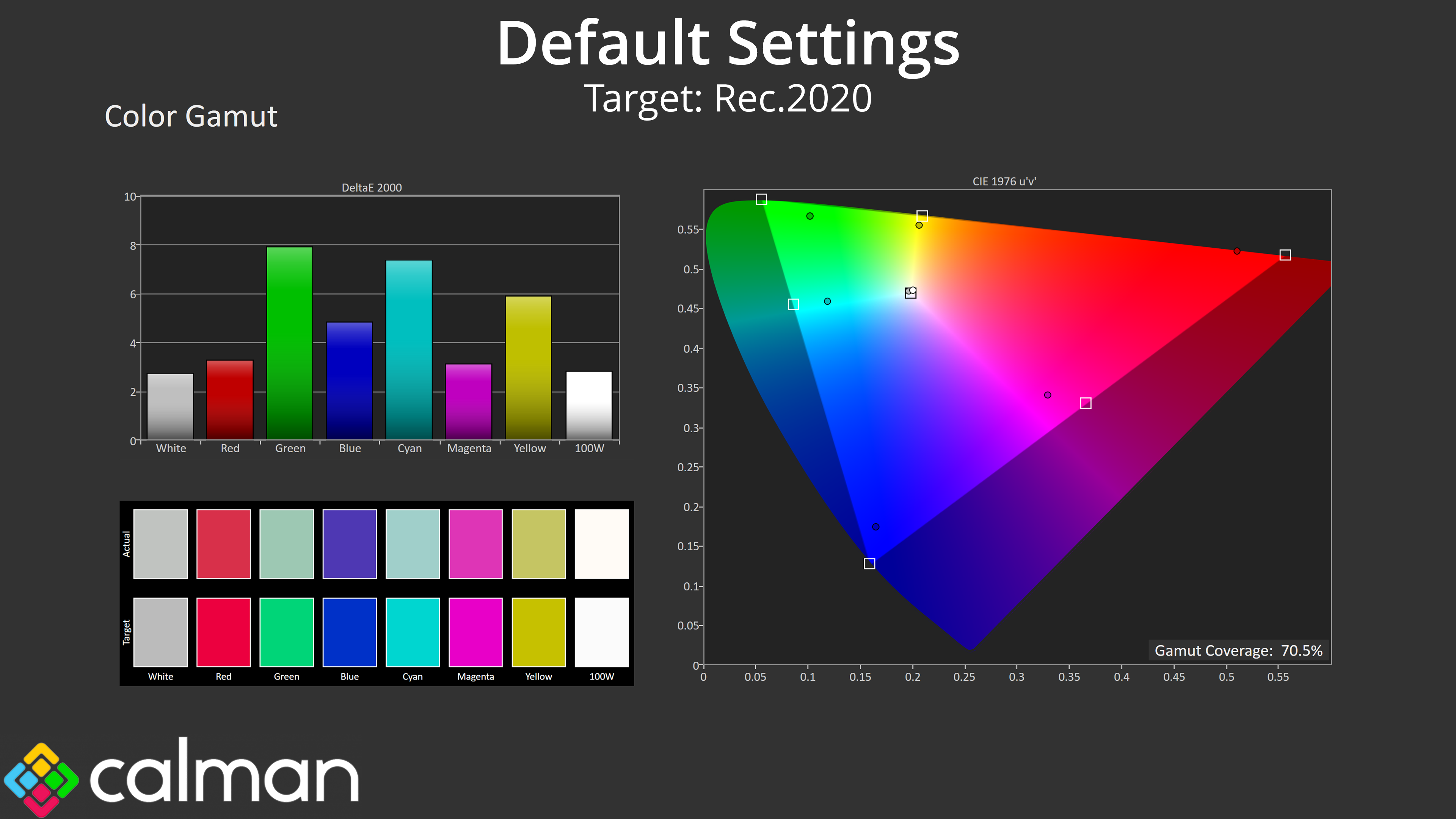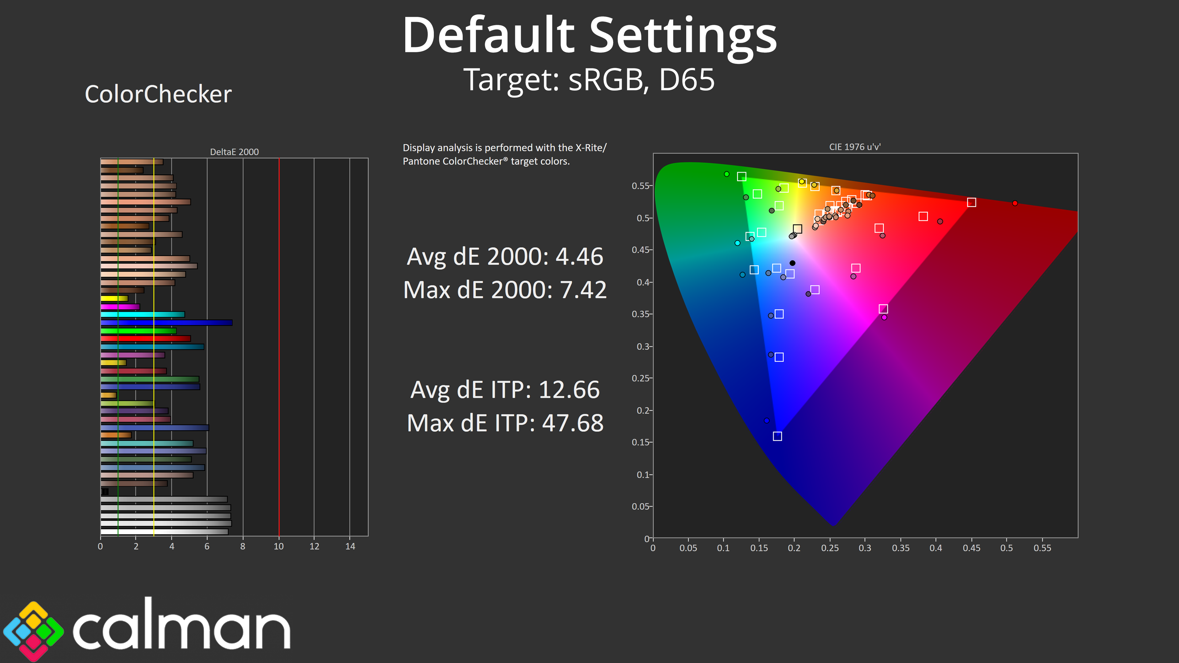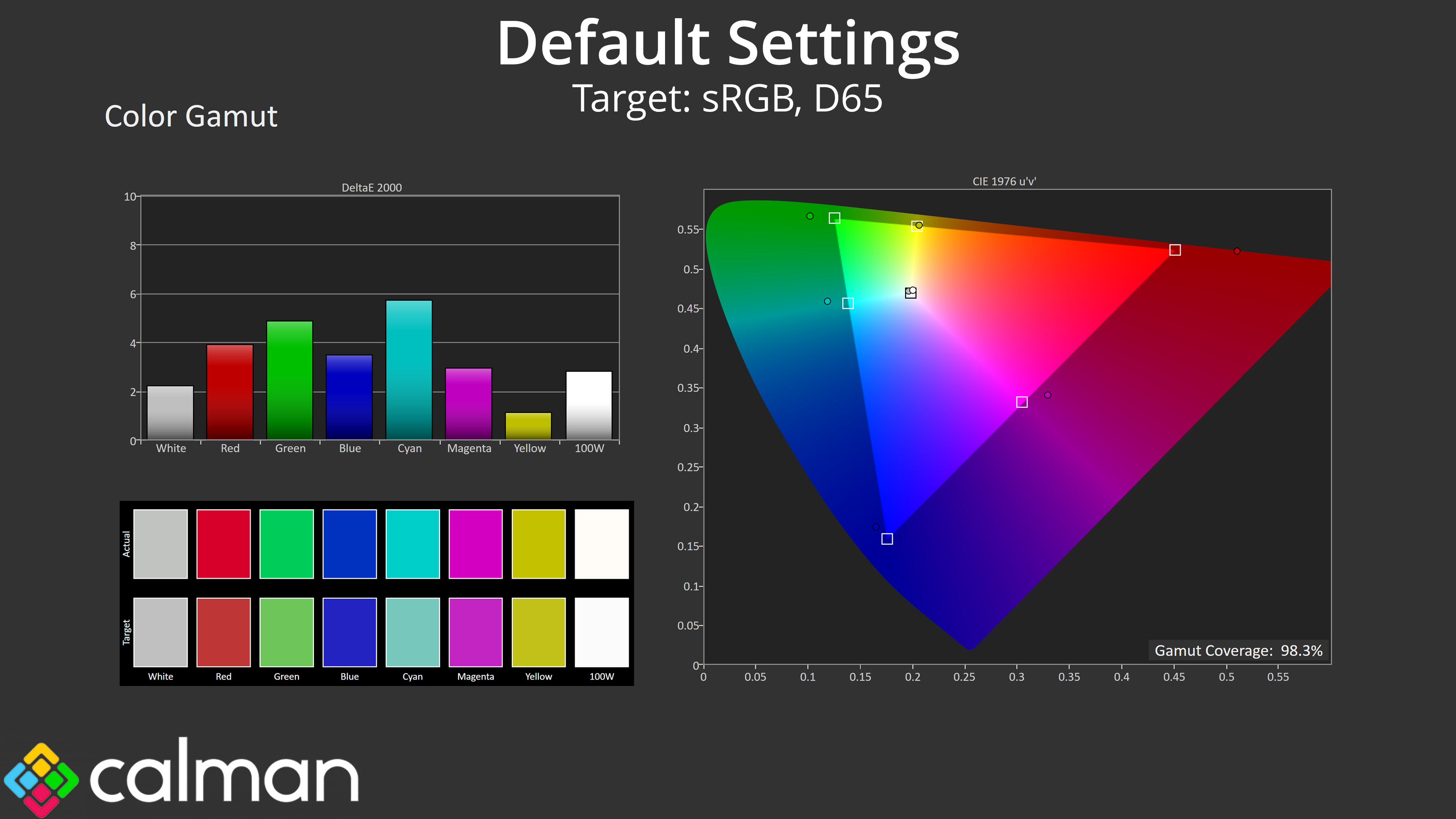 We first run these tests with the display in its out-of-the-box state, with all settings on default. If there is an sRGB emulation option or other useful mode then we may test that too. We then calibrate the screen using the Calman Ultimate software and run the tests again.