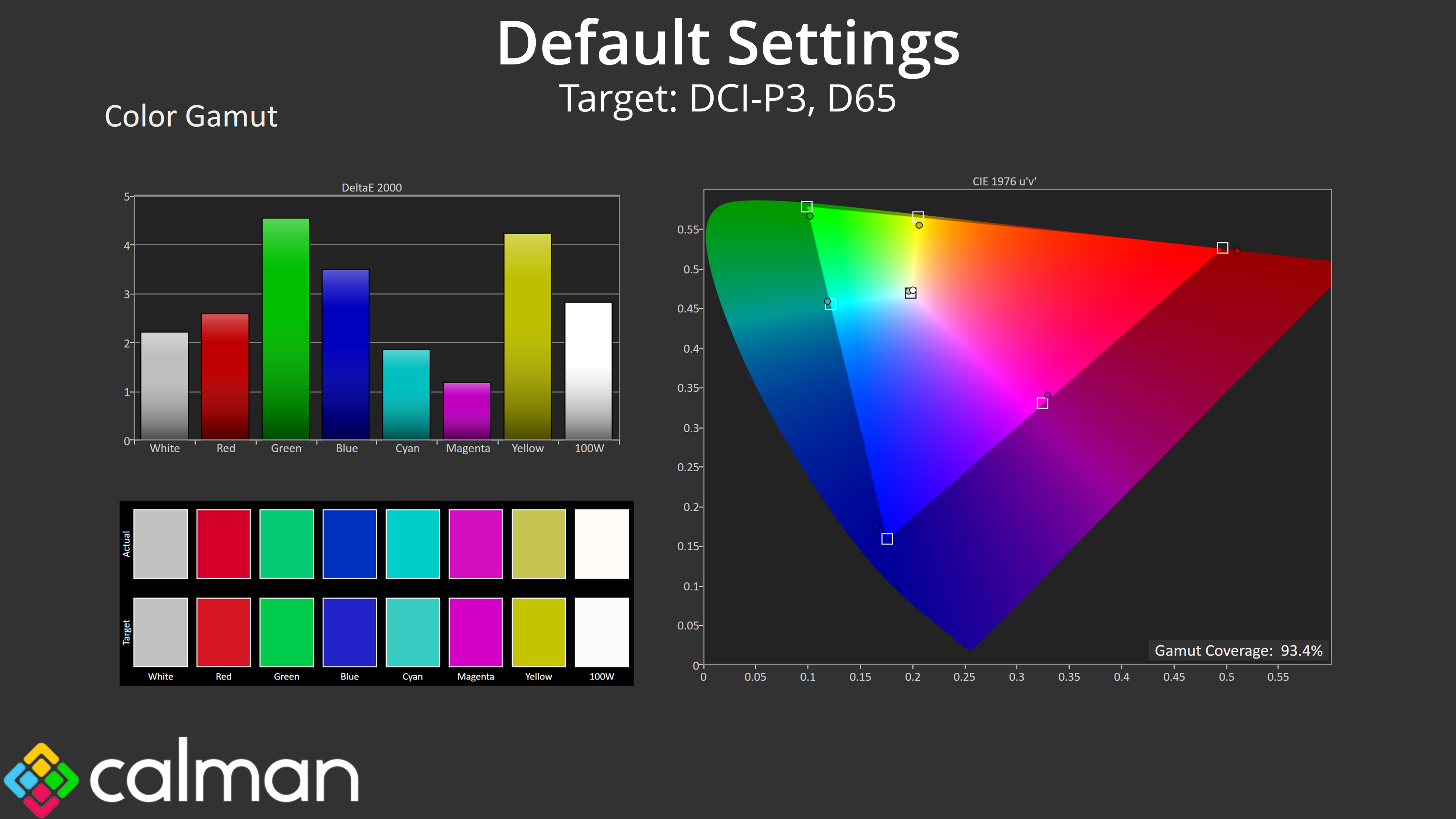 The same also goes for colour accuracy. Against the sRGB space, the high levels of oversaturation means overall accuracy is poor, averaging a dE 2000 of 4.46. Comparing against DCI-P3 though, this improves to 2.36.