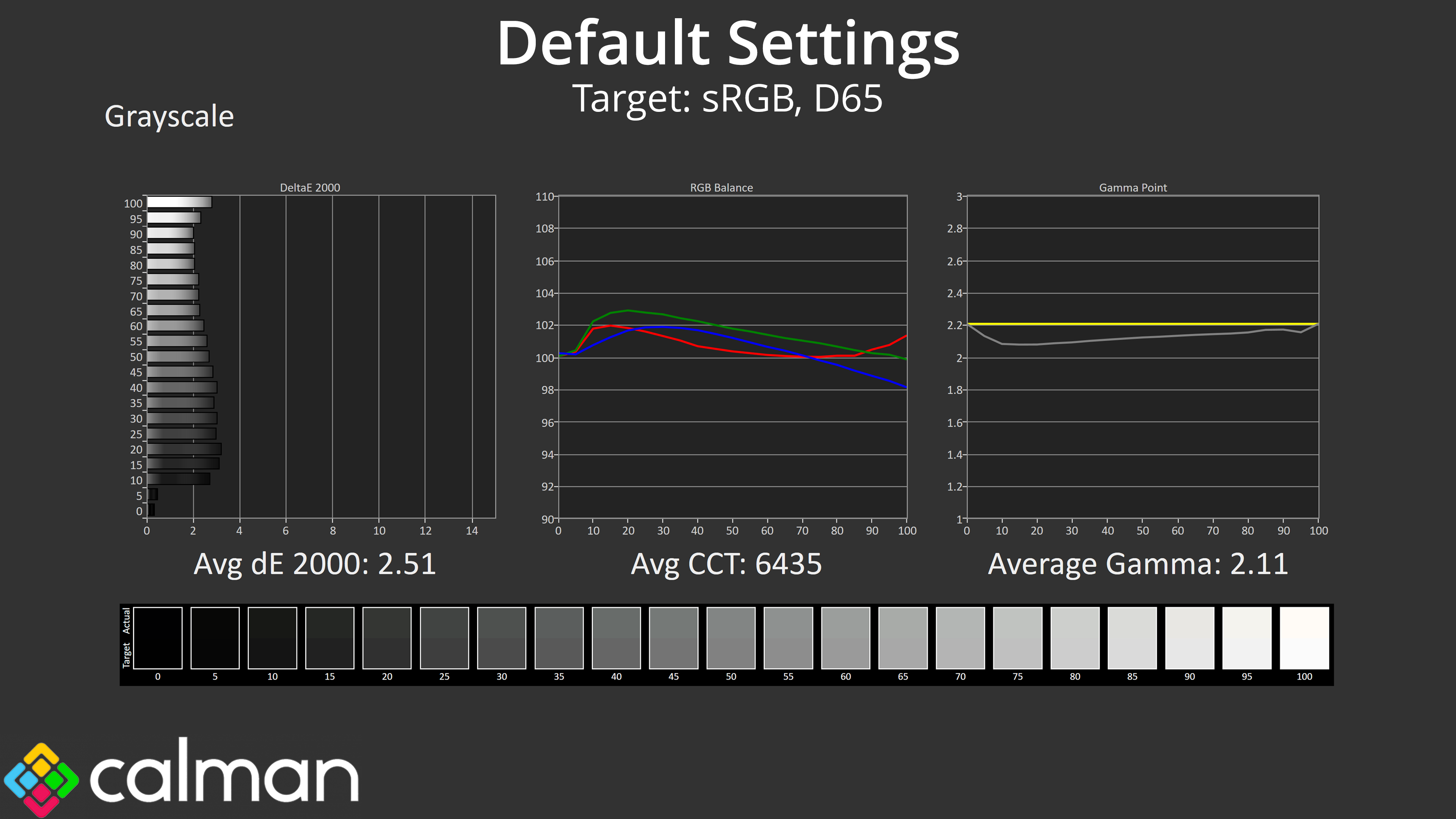 Default greyscale is also generally well configured from the factory. The average colour balance of 6435K is very good, though the green channel is just a little stronger than the rest, but we're talking very small margins here. Gamma is also a touch low in the darker shades, but picks up towards the end of the curve.