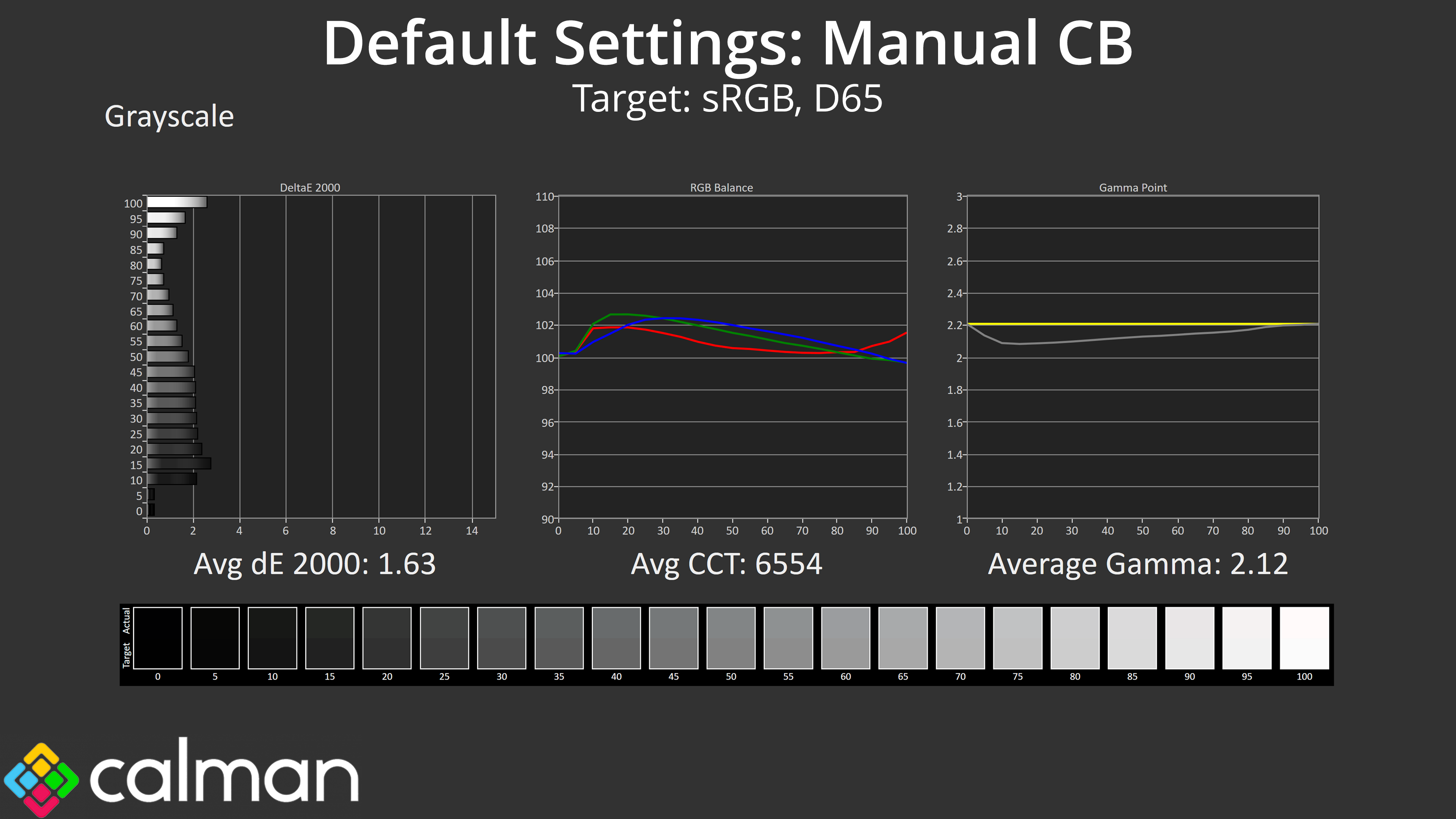 Just to see if we could improve things, I set a manual colour balance in the OSD, leaving the Red channel at 50 but knocking both Green and Blue down to 49. This is admittedly a minor change, but it did help make the colour balance that bit more accurate, improving the greyscale average dE 2000 to just 1.63.