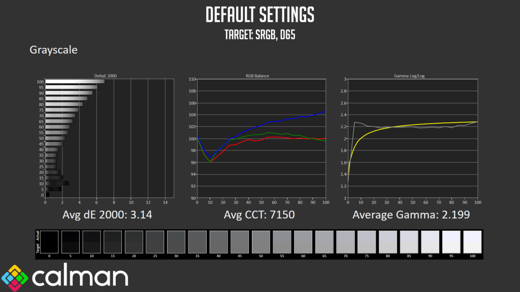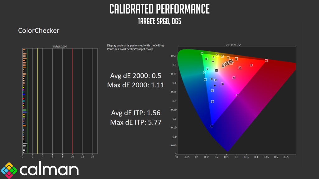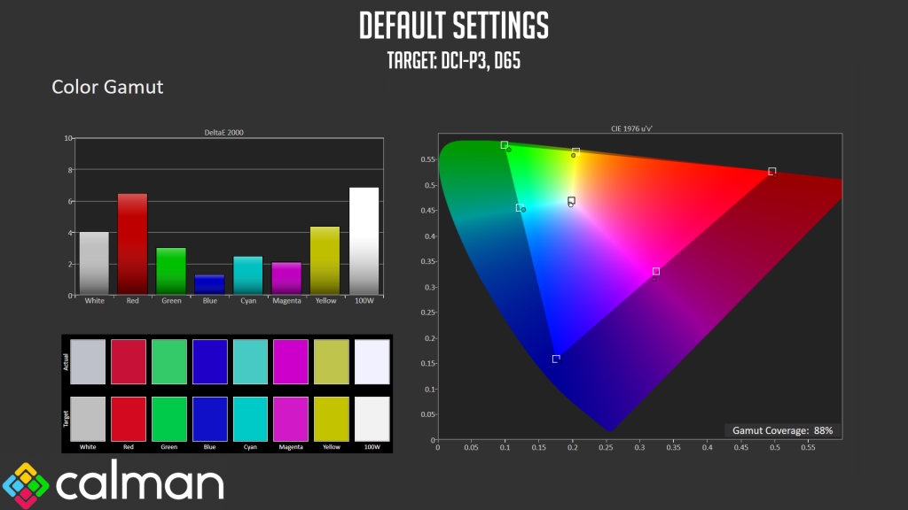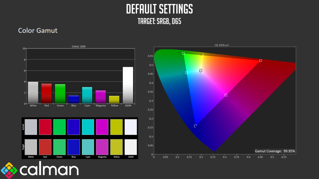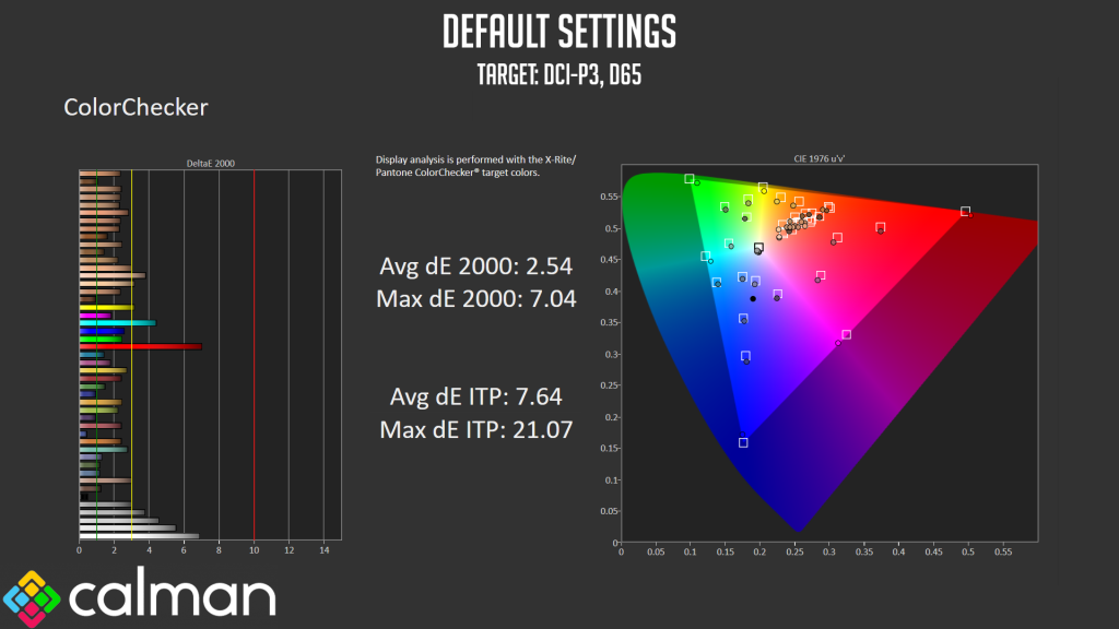 We first run these tests with the display in its default, out-of-the-box state, with all settings on default. We then calibrate the screen using the Calman Ultimate software and run the tests again.