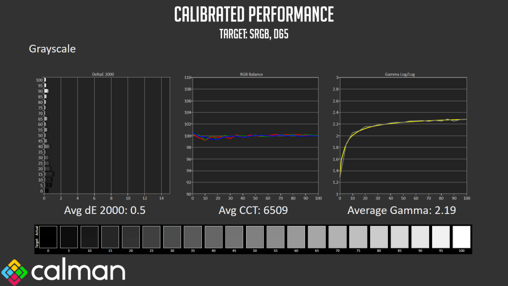 - Greyscale accuracy, measured across 20 shades, with an average colour balance reported.